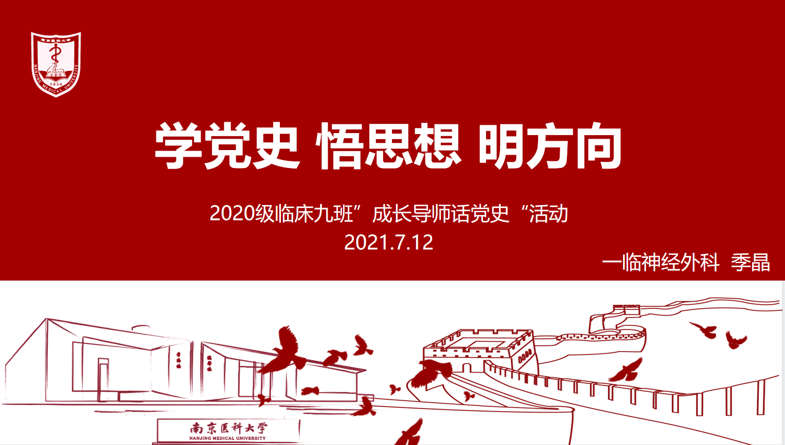 2021年7月12日晚,2020级临床医学(五年制)9班召开线上“成长导师话党史”活动。班级成长导师,第一临床医学院副院长,江苏省人民医院神经外科主任医师季晶教授为同学们讲授了一堂丰富精彩的线上党史课。