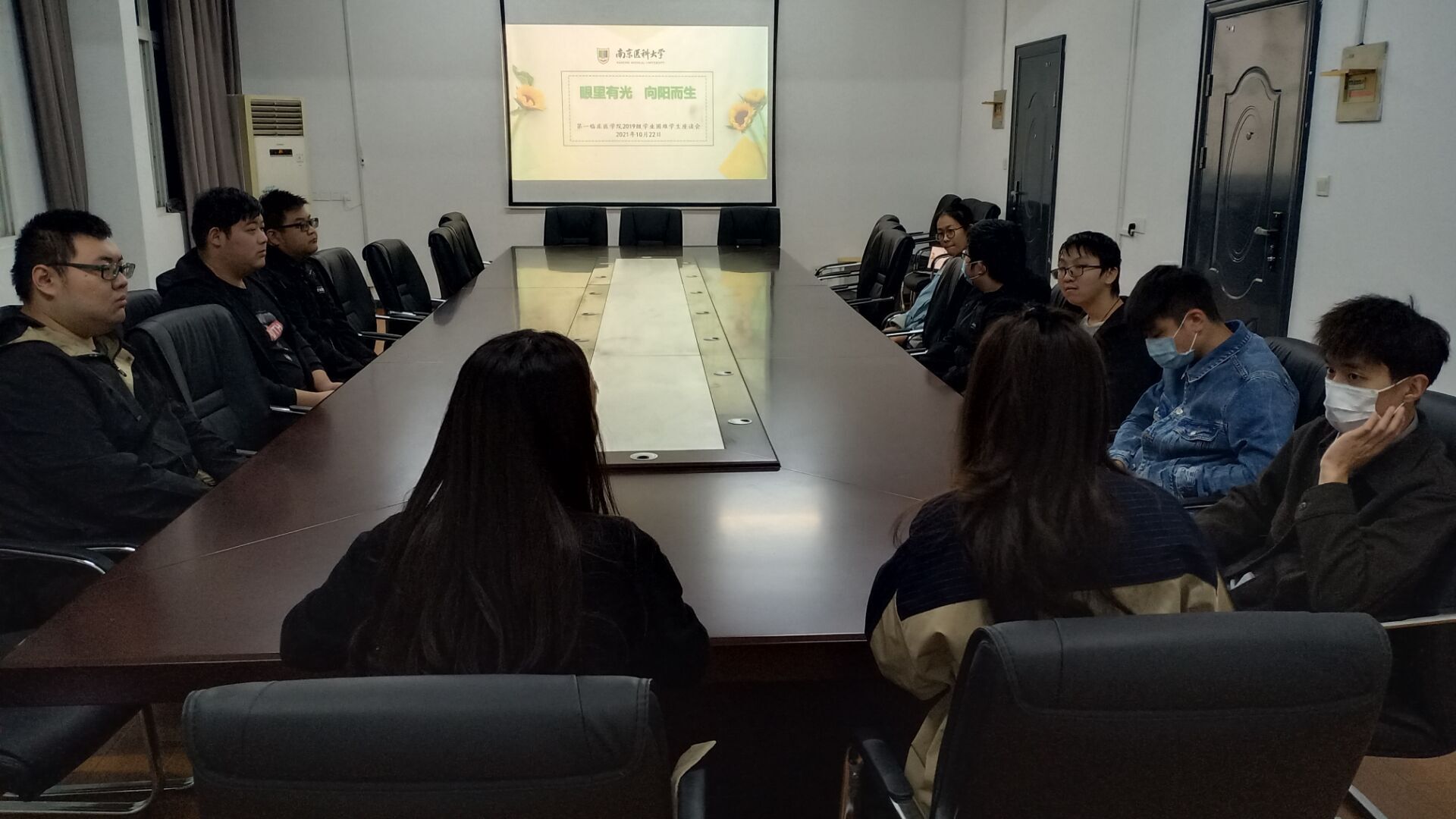 10月22日晚18:00,第一临床医学院2019级学工办于09栋136会议室开展了“眼里有光,向阳而生”为主题的学业困难学生座谈会。辅导员梁瀚元、张婷婷与8位学业困难学生参加此次座谈。