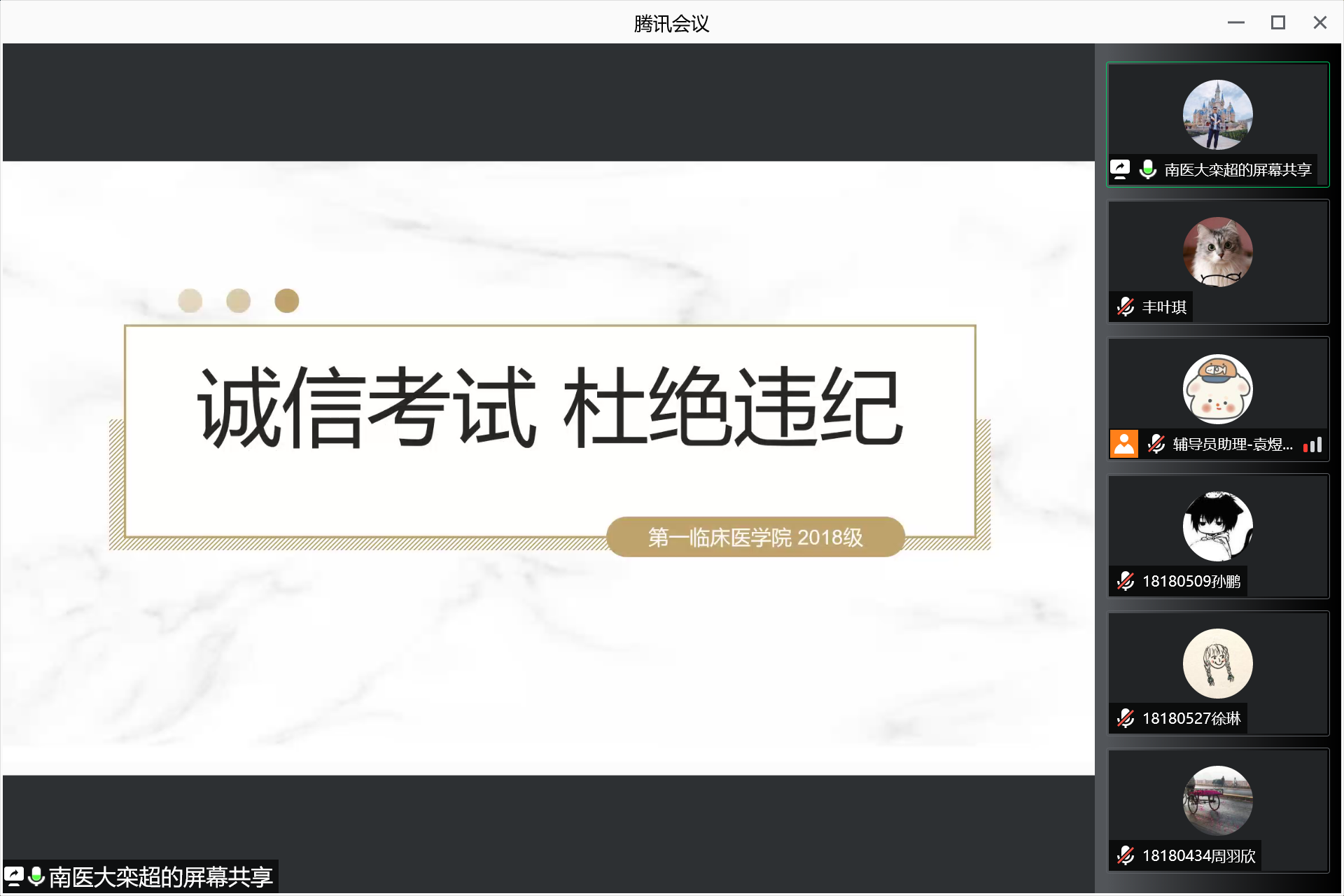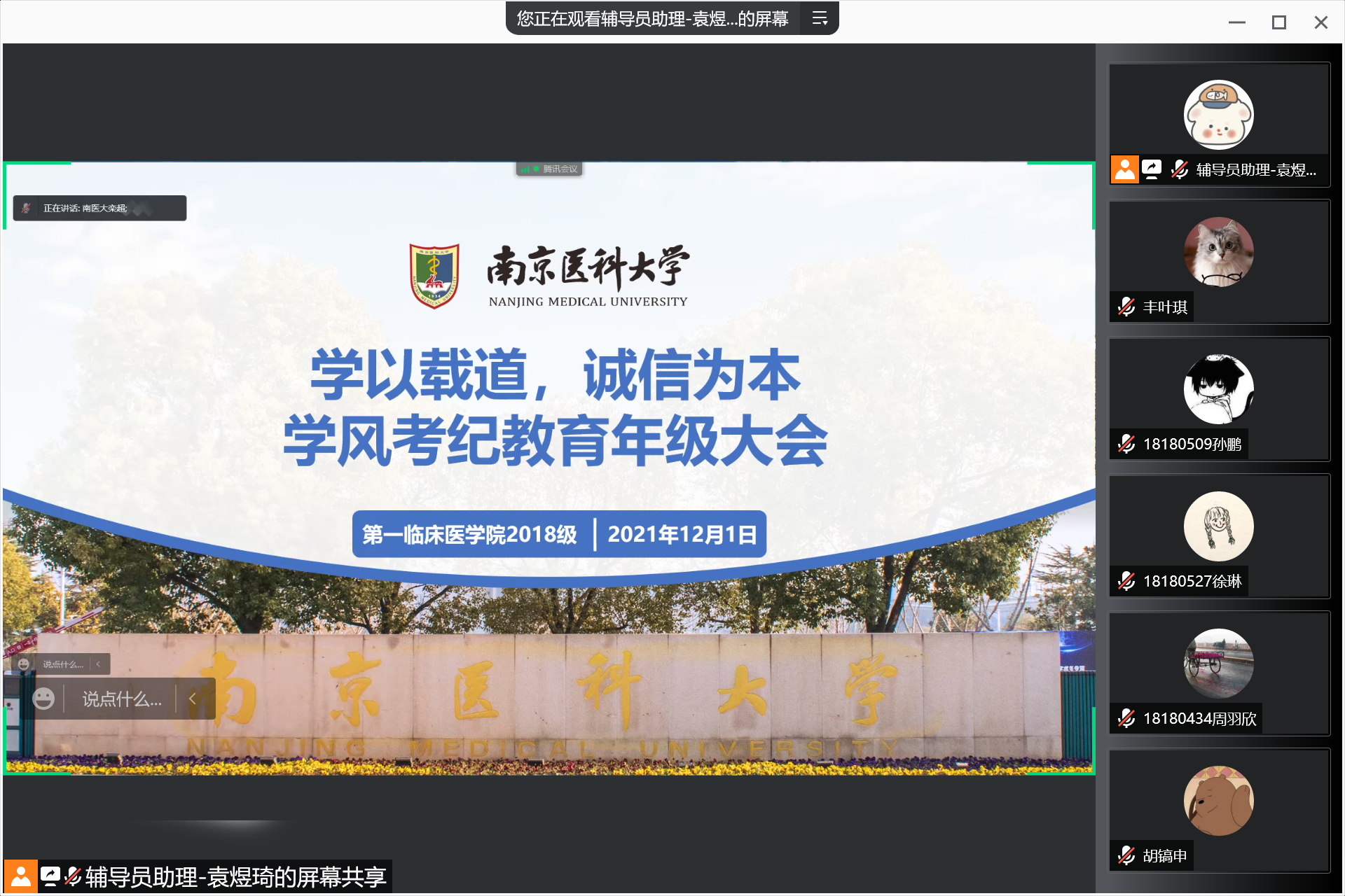 12月1日,在本学期统考临近之际,第一临床医学院2018级通过腾讯会议线上召开了学风考纪教育大会,帮助同学们调适应考心理,督促同学们认真迎考,提醒同学们严肃考风考纪。会议由辅导员陈琪波老师主持。