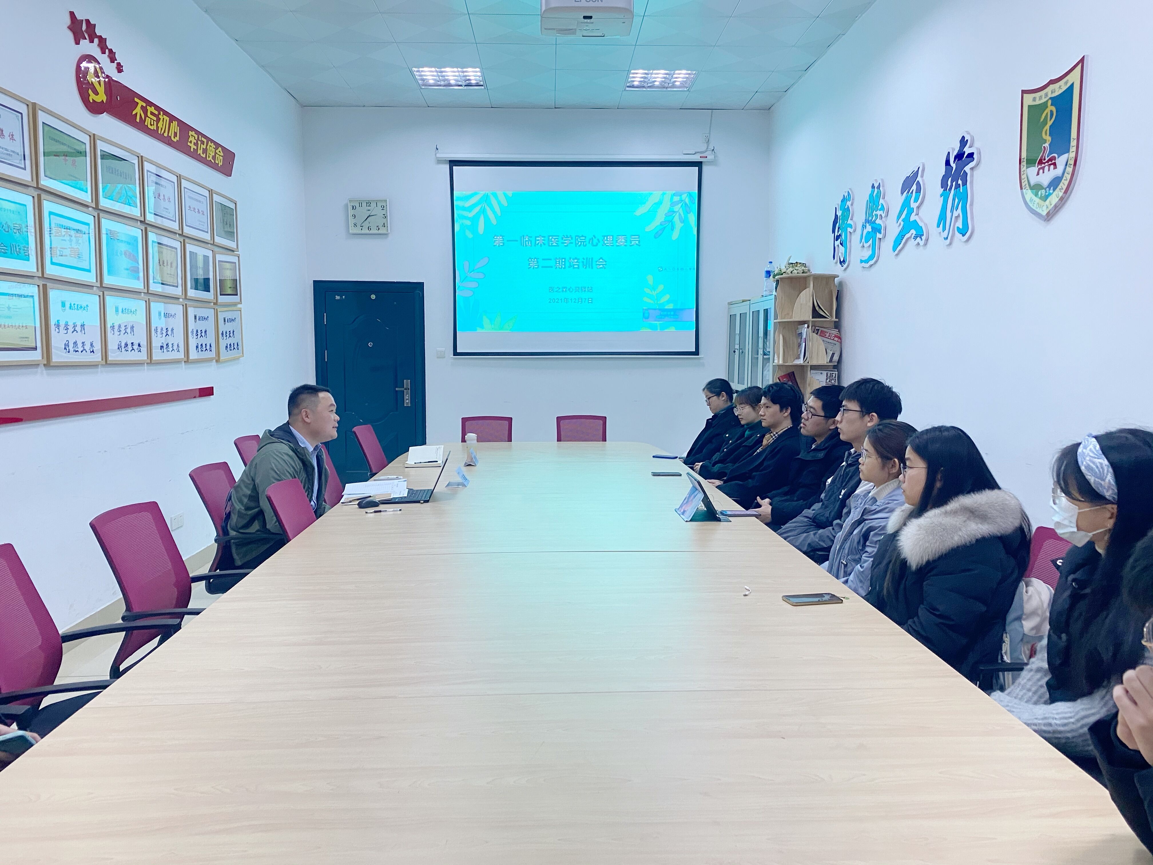 2021年12月7日,第一临床医学院“医之霖心灵驿站”心理委员第二期培训会在“一站式”学生事务与发展中心会议室进行,本期培训主题为“精准识别,强化预警”,辅导员张婷婷、王保健、2020级各班心理委员参加培训会。
