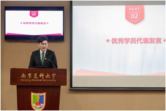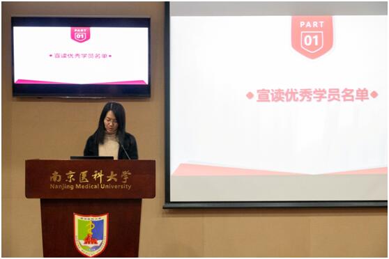接着学生会主席阚苏童主持“医霖英才”学干培训营闭营仪式,管园园副书记宣读了本次学干培训的优秀学员名单,21级赵希祥同学作为优秀学干代表发言,分享培训心得体会,随后苏书记为学干代表颁发结业证书。