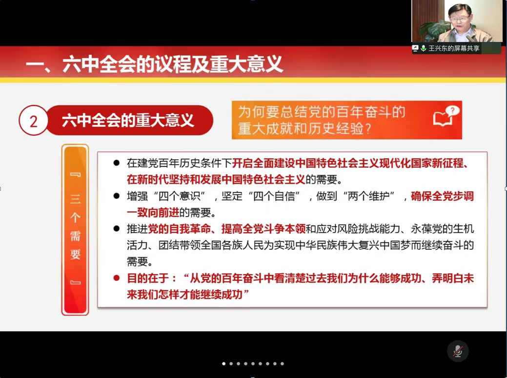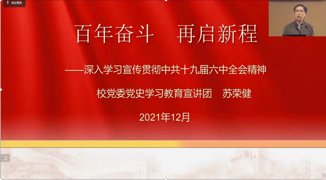 沈常委、王部长和苏书记分别以“百年奋斗 再启新程”为题,从党的十九届六中全会的议程及重大意义、《中共中央关于党的百年奋斗重大成就和历史经验的决议》的主要内容及重大创新,认真贯彻十九届六中全会精神等方面进行阐释和宣讲,通过时间轴全面回顾了党的百年奋斗历程,梳理了中华民族伟大复兴进程,总结党的百年奋斗重大成就和历史经验的意义。指出学生党员认真学习贯彻落实十九届六中全会精神,把思想统一到《决议》精神上来,落实号中央的各项部署,把十九届六中全会精神融入到党史学习教育,结合六中全会精神,推动学校事业发展取得新突破。