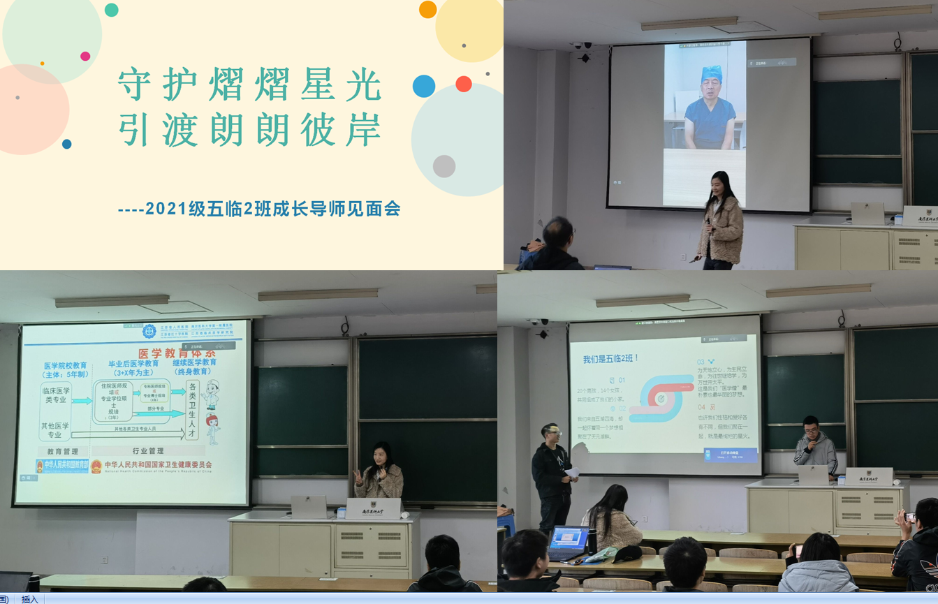 12月2日下午,第一临床医学院2021级临床医学2班在明达楼K120开展了主题为“守护熠熠星光,引渡朗朗彼岸”的成长导师见面会。南京医科大学第一附属医院眼科主任刘庆淮教授云端连线参会,一附院眼科副主任张薇玮教授、2021级临床医学2班全体学生线下参会。