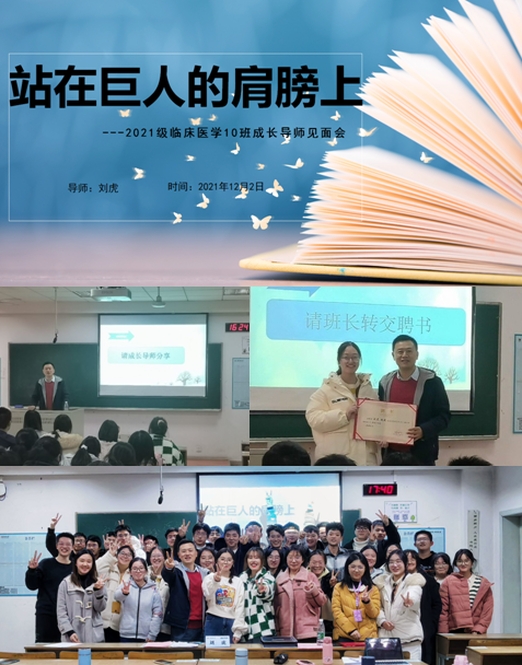 12月2日下午,第一临床医学院2021级临床医学10班在博学楼A105召开了“站在巨人的肩膀上”成长导师见面会。班级成长导师、一附院眼科副主任刘虎教授,学姐辅导员黄佳及2021级临床医学10班全体同学出席了本次会议。