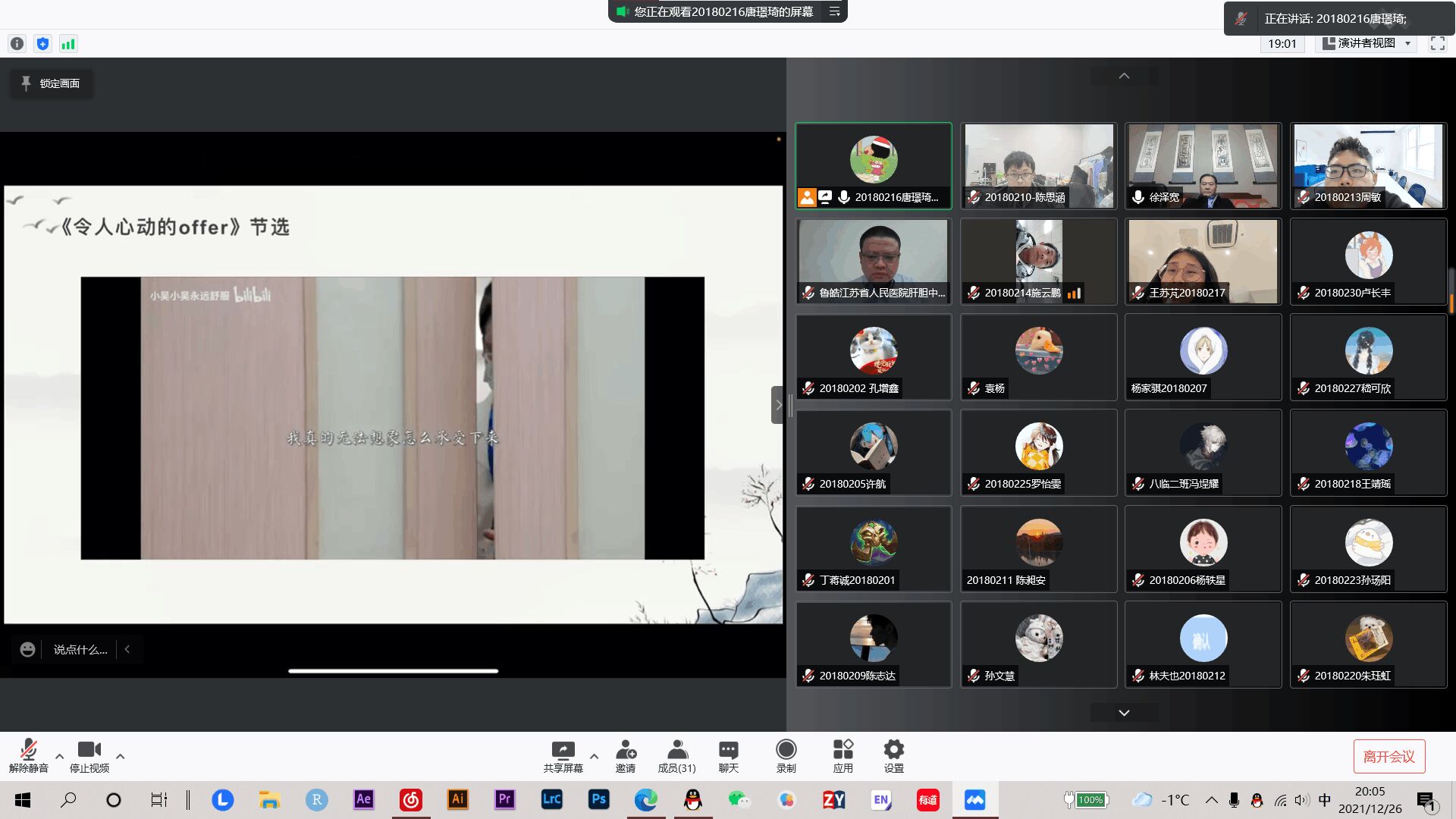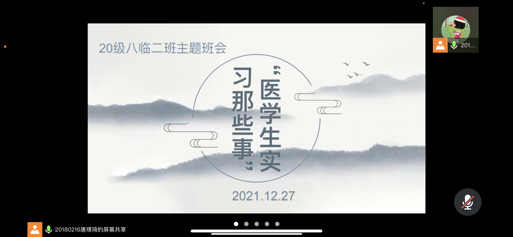 12月26日晚,第一临床医学院2020级临床医学(5+3一体化)2班通过腾讯会议平台与成长导师徐泽宽主任以及新任兼职班主任鲁皓医生连线,围绕“医学生实习那些事”主题召开班会。班长唐璟琦同学担任主持人。