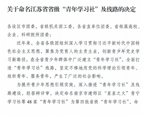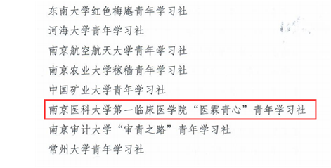 日前,共青团江苏省委下发《关于命名江苏省省级“青年学习社”及线路的决定》,第一临床医学院“医霖青心”青年学习社成功获评省级青年学习社,成为南京医科大学第三个省级青年学习社。