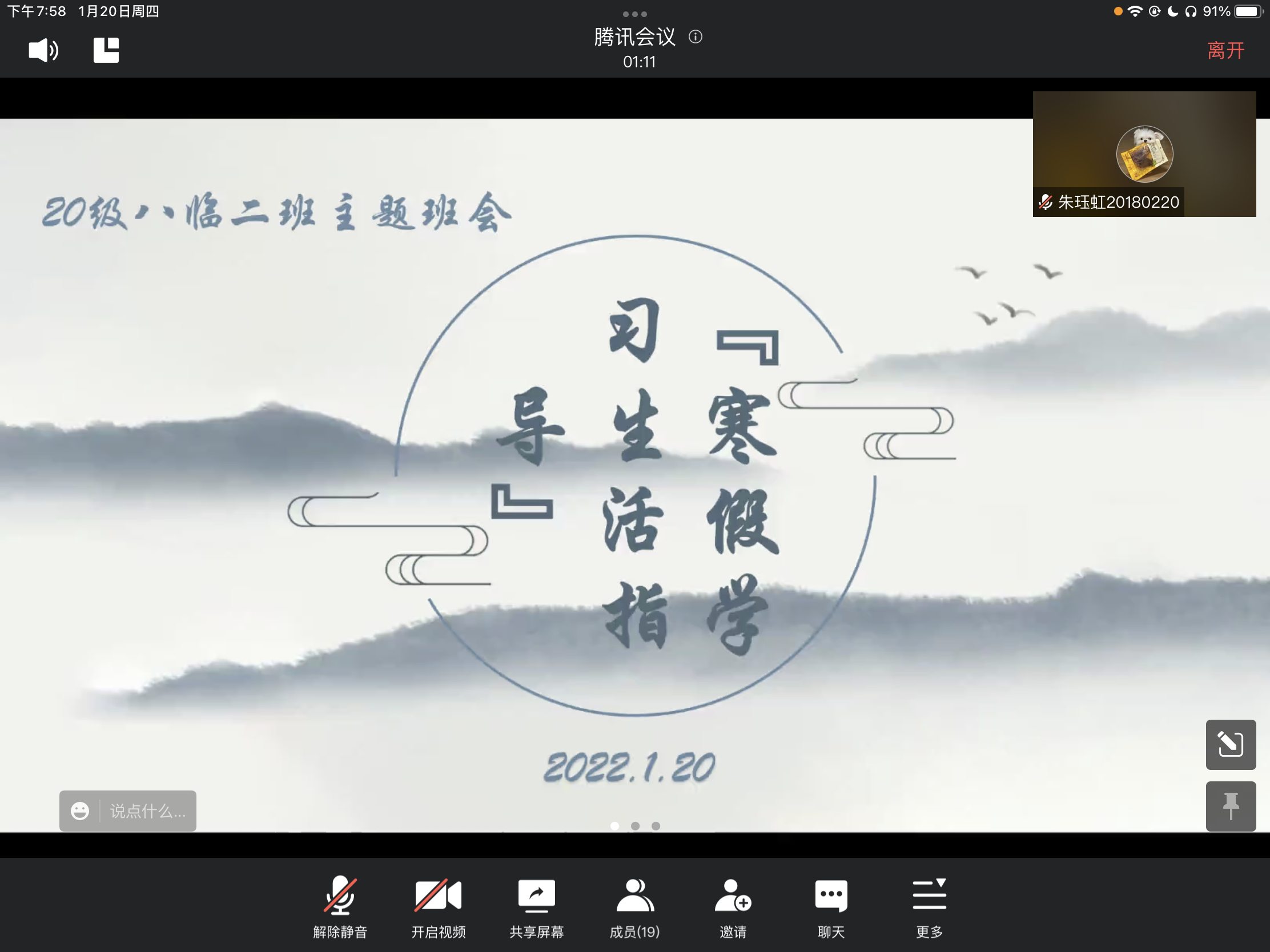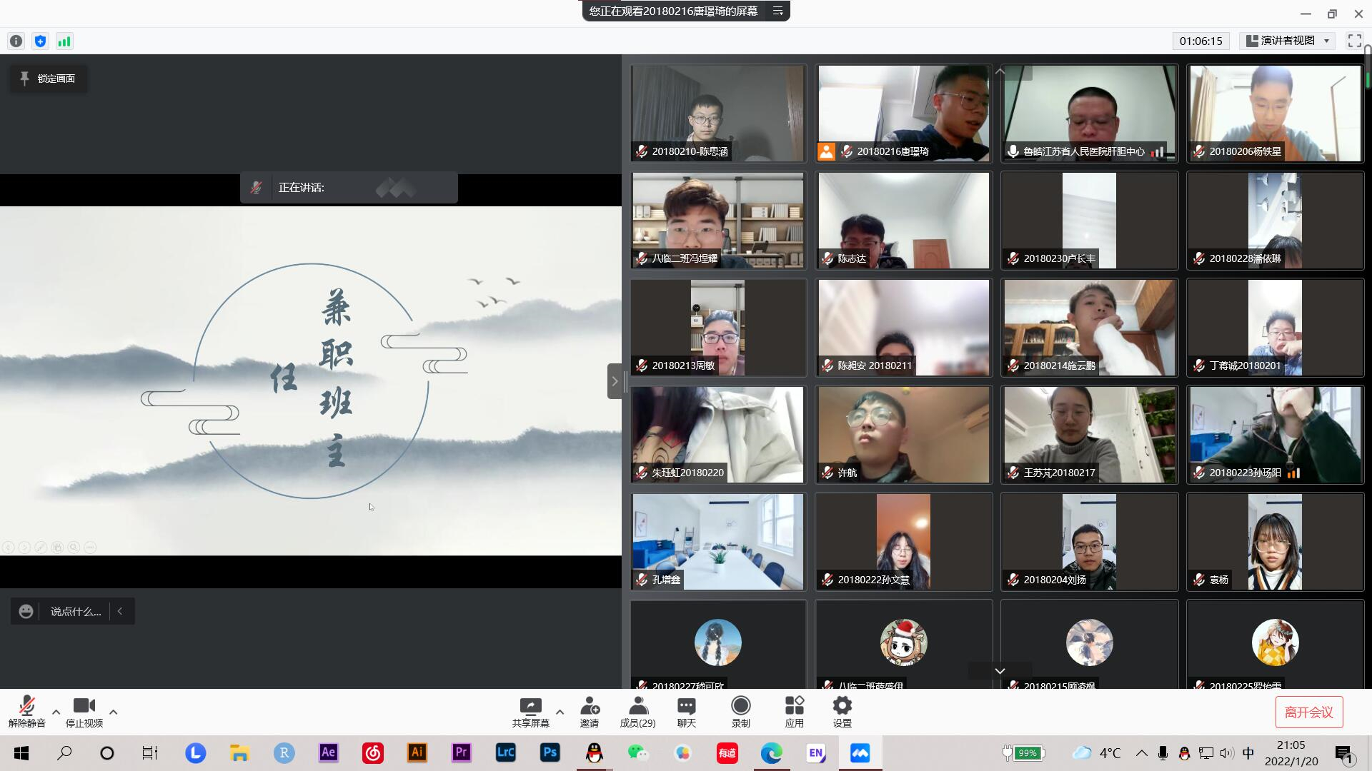 2022年1月20日晚,第一临床医学院2020级临床医学(5+3一体化)2班通过腾讯会议平台与兼班级职班主任鲁皓老师连线,由鲁老师为同学们进行寒假学习生活指导。会议由班长唐璟琦同学主持。