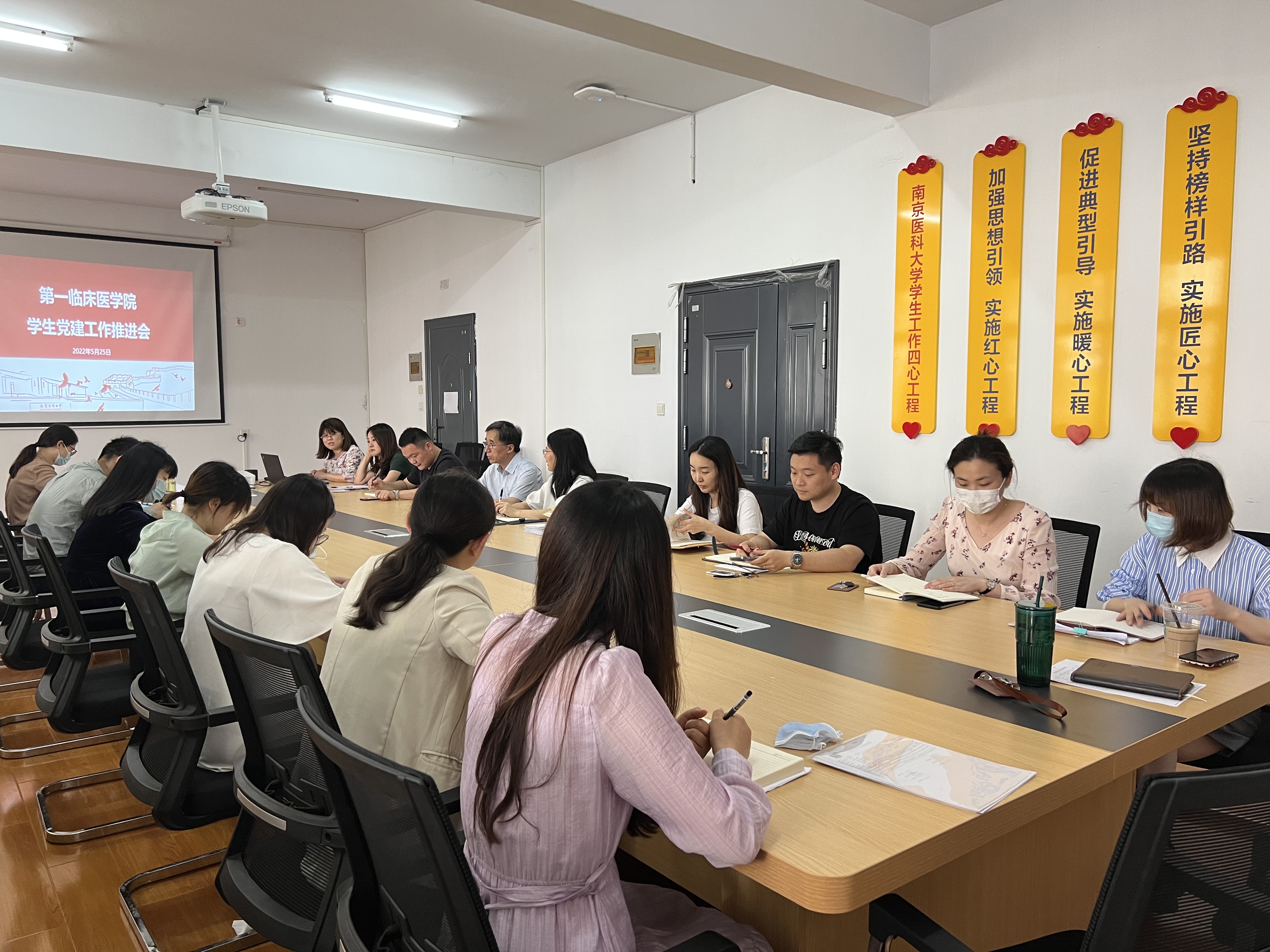 5月25日下午,第一临床医学院在江宁校区09栋会议室召开了学生党建工作推进会,学院党委常务副书记苏荣健、副书记副院长管园园、组织员孟楠,以及全体辅导员参加了会议。