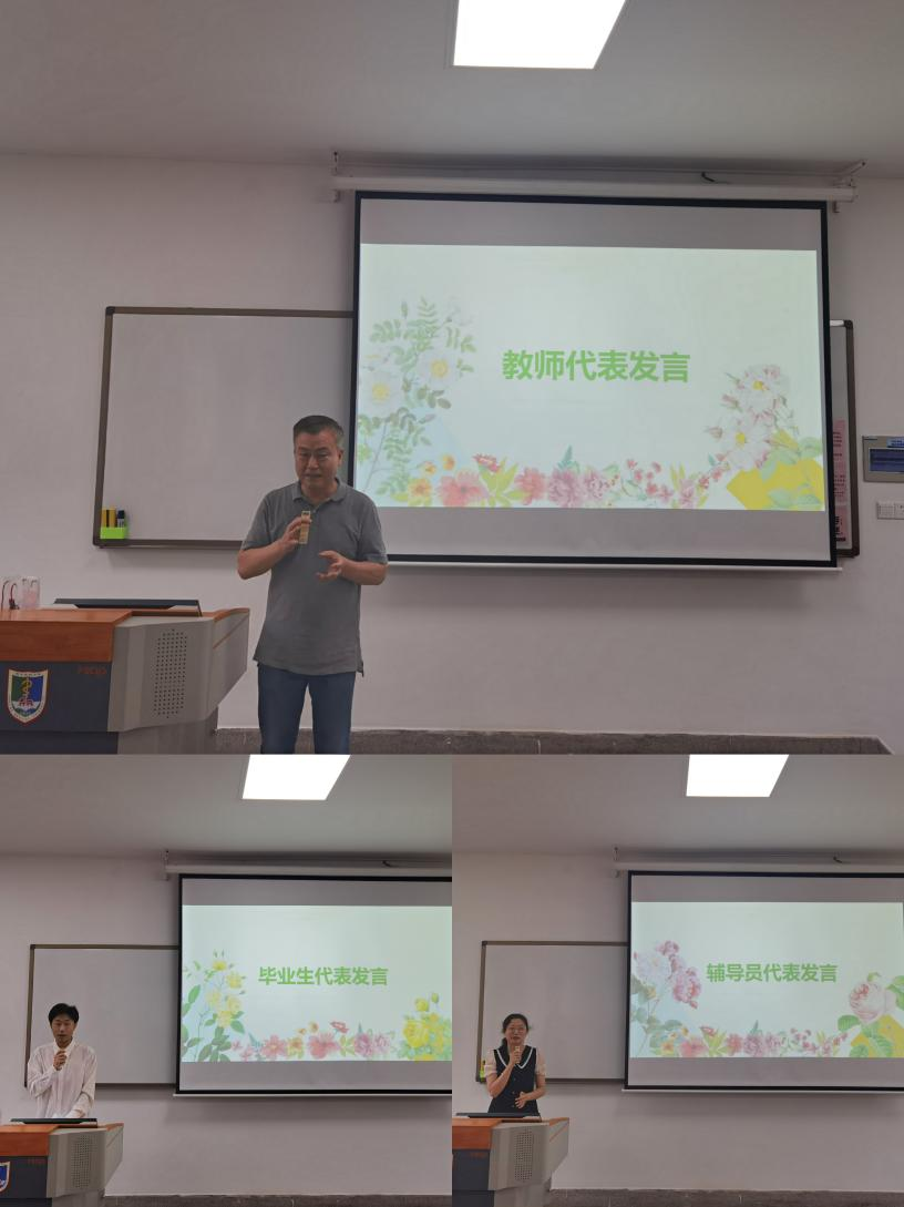毕业生代表陈明晖同学和大家一起分享了四年的点点滴滴,以梦想为话题做了发言,希望大家勇于创新、敢挑重担、不断向前。教师代表检验学系潘世扬主任从“祝贺”“感谢”“祝福”三个方面表达了对同学们过去四年以来的学习的肯定、对老师们辛勤付出的感谢、以及对各位同学未来人生道路的美好祝愿。随后,陪伴大家走过四年的辅导员老师代表,陈琪波老师同样向大家表达了感谢与祝福,祝愿同学们,在未来的人生道路上,无论顺境还是逆境,都要保持一颗向上向善的心。