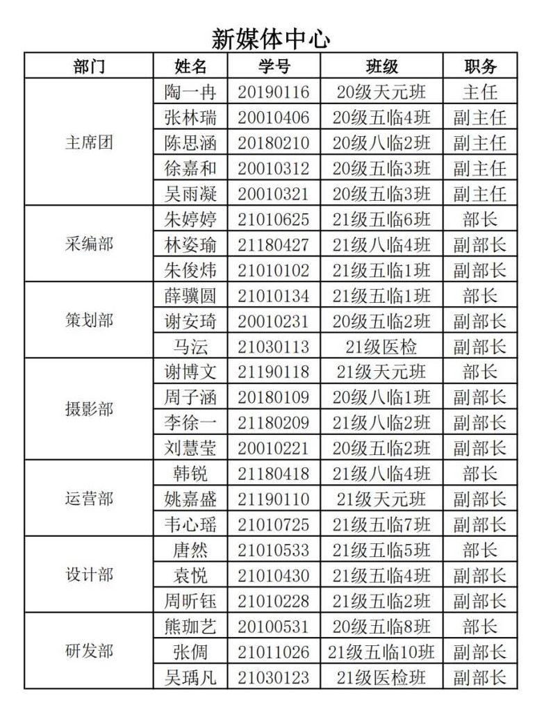 本着公开、公正、公平的原则,经学生自主报名、资格审查、竞职演讲、民主投票,同时结合平时工作开展情况进行综合考察。经研究讨论决定,拟选拔确定以下同学担任2022-2023学年第一临床医学院团学组织学生干部主要成员,具体名单如下: