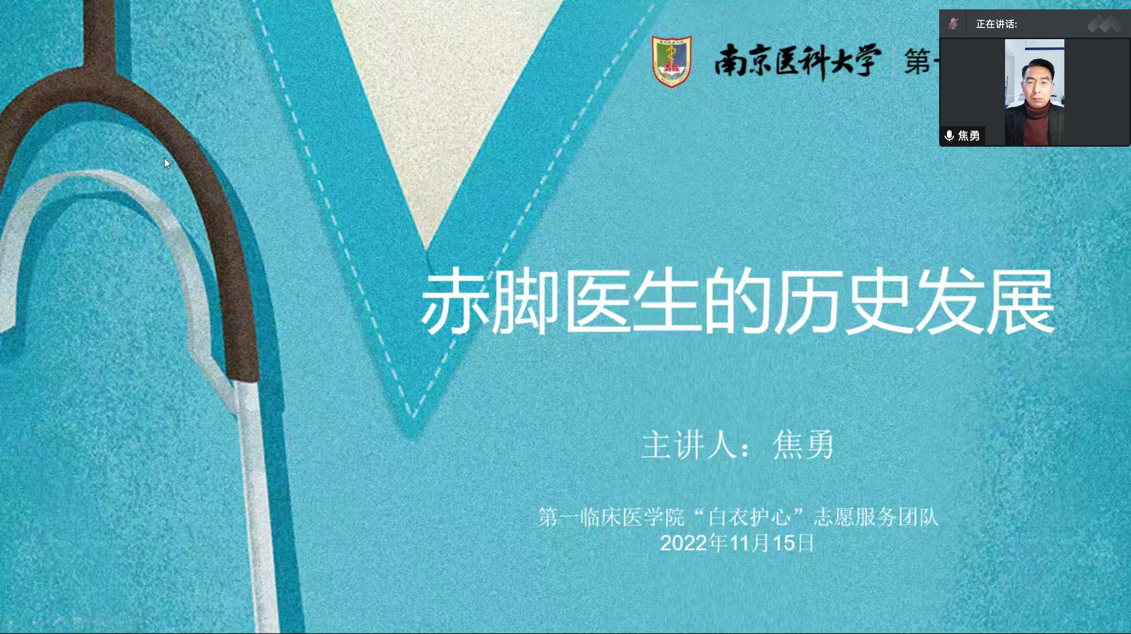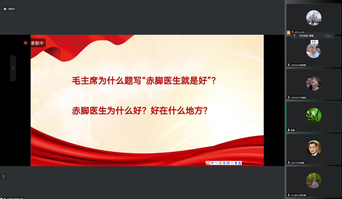 一肩药箱一肩锄,银针草药把病除。为了更好发扬赤脚医生舍己为人,救死扶伤精神,深刻领悟医学生使命担当,11月15日晚,我院开展了《赤脚医生的历史发展》线上讲座,本次讲座由第一临床医学院栾超老师主持,学院党委副书记副院长管园园及辅导员老师出席,第一临床医学院农村订单班同学以及“白衣护心”志愿团队成员参加讲座。