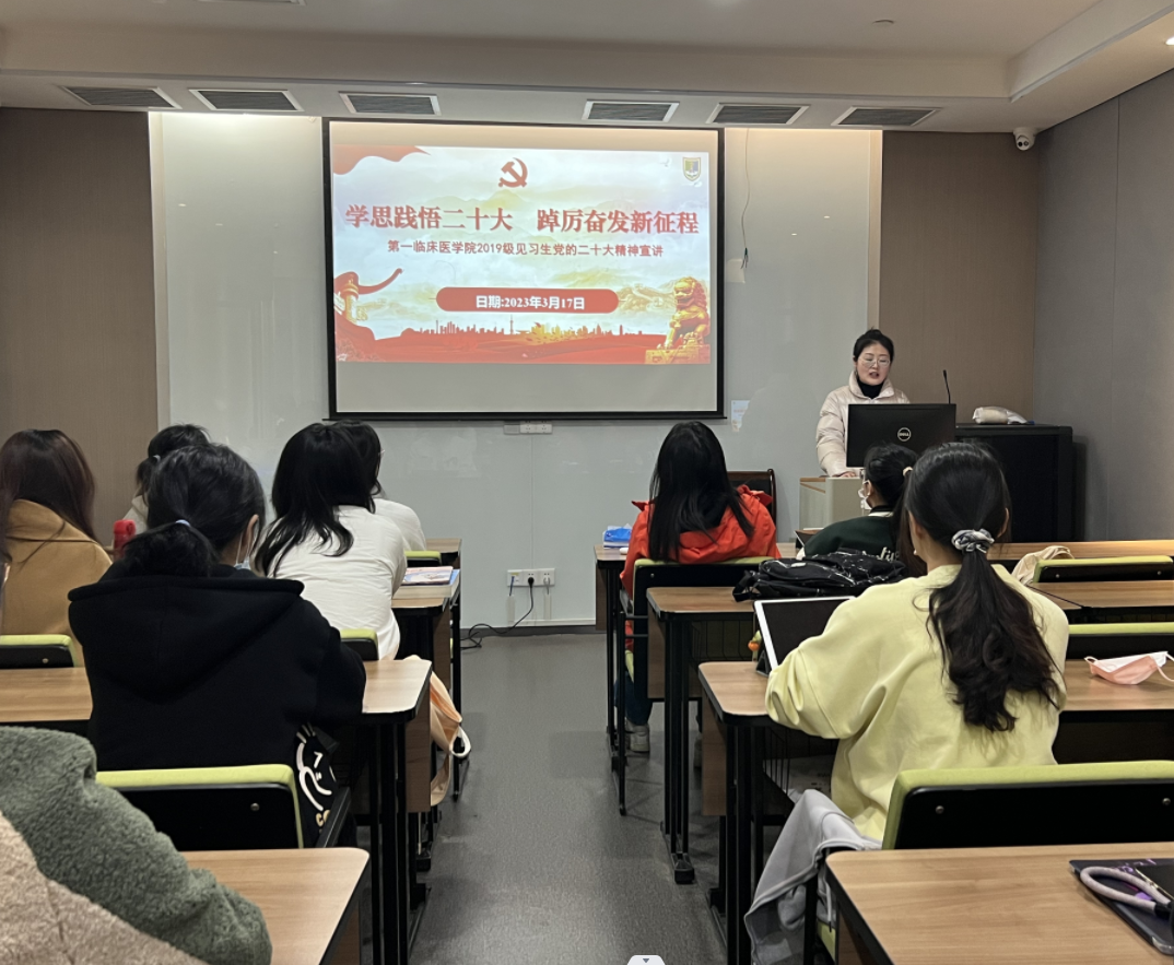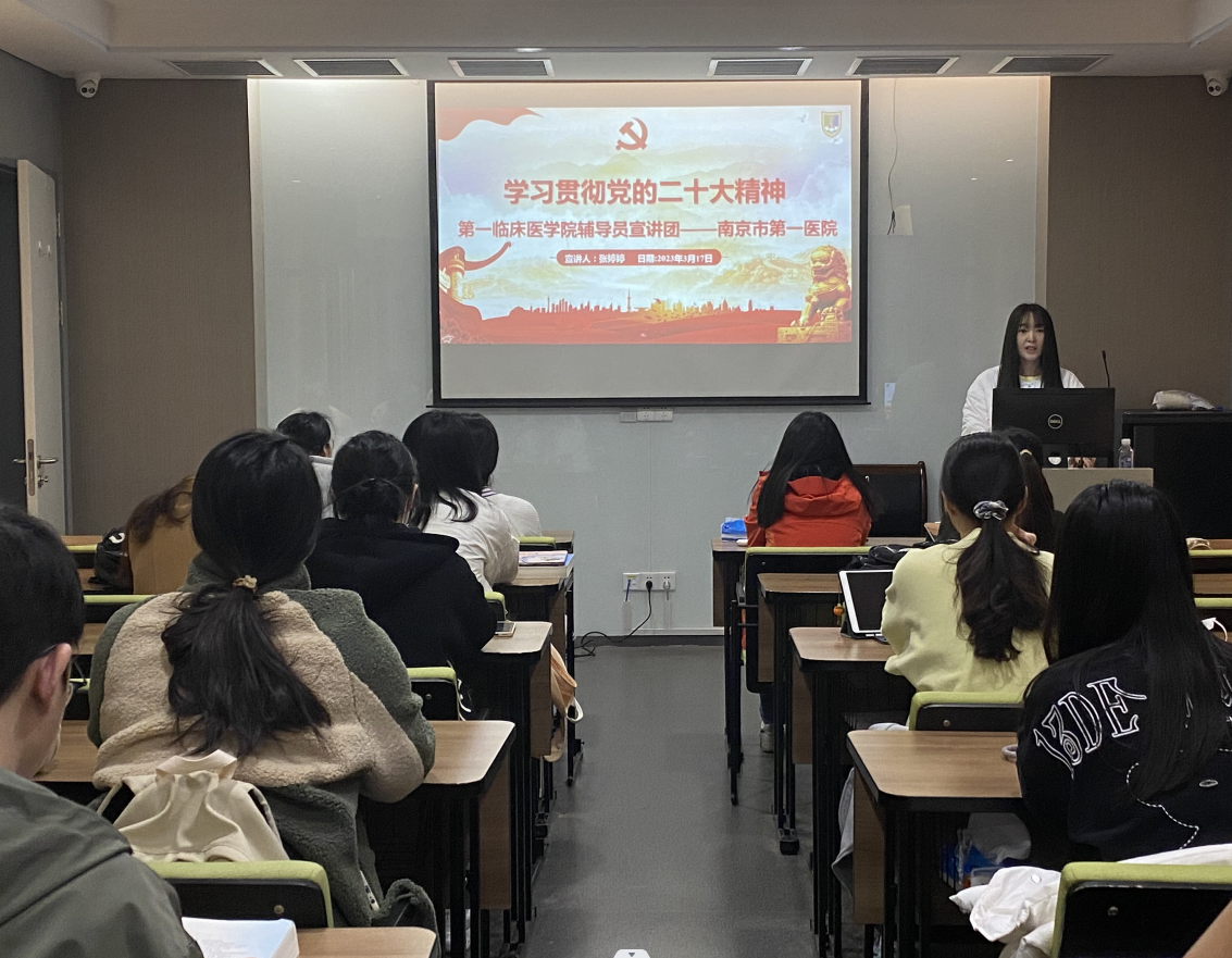 3月17日,为扎实推进学习宣传贯彻党的二十大精神,进一步引领见习点学生学习宣传贯彻党的二十大精神,2019级辅导员梁瀚元、张婷婷老师走进南京市南京市第一医院见习点向同学们开展以“学思践悟二十大 踔厉奋发新征程”为主题的二十大精神宣讲活动,临床(5+3)一体化4班全体同学参加。