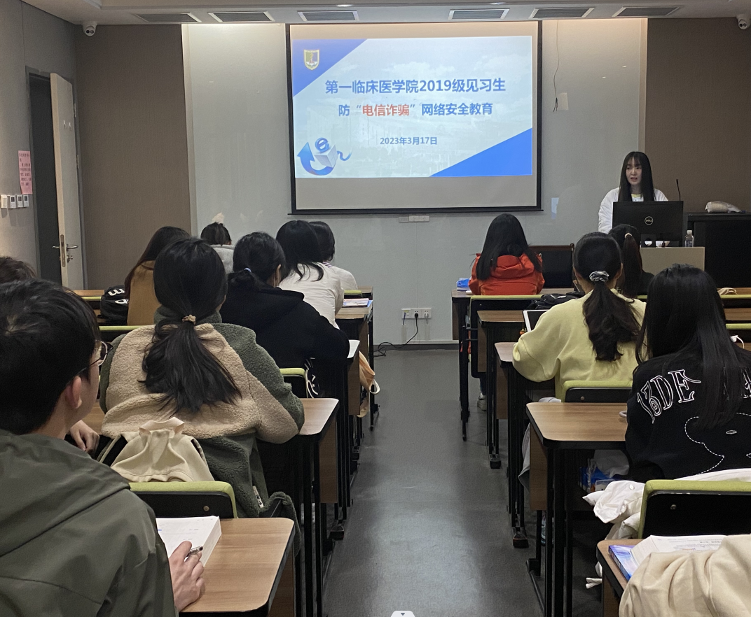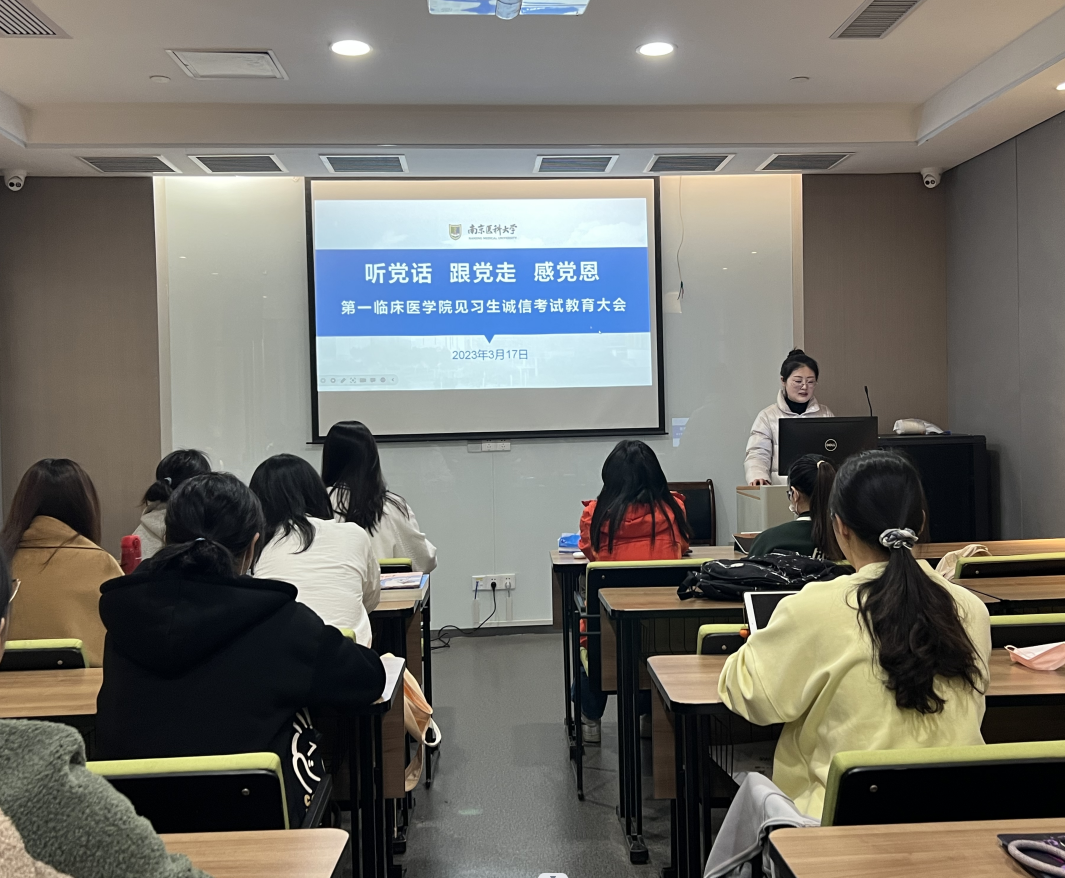 3月17日,第一临床医学院2019级辅导员赴南京市第一医院召开“守纪律 防诈骗 严考风”主题班会,2019级临床(5+3)一体化4班全体同学参加。