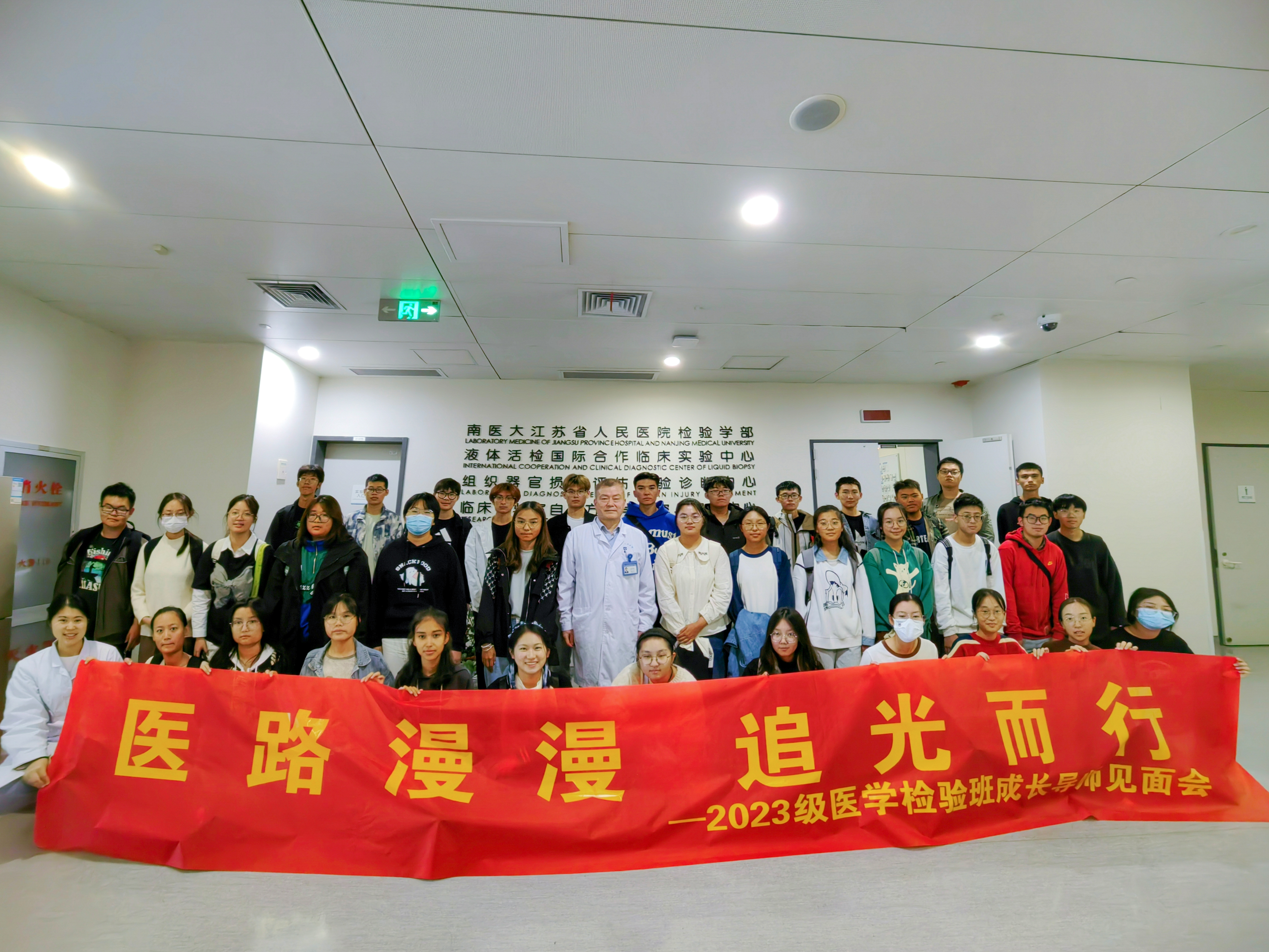 2023年10月23日下午1点,23级医学检验班全体成员在班长的带领下,到江苏省人民医院参加了成长导师见面会。与会人员有潘世扬教授、王芳教授、蒋叶老师、王婷老师、吴昱青老师以及23级医检班全体成员。