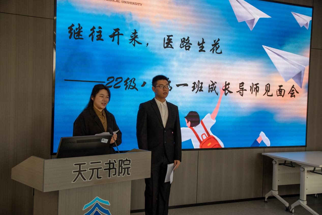 会上,八临一班的同学们与成长导师王晓伟教授进行了深入的交流。首先,班长余诗睿同学和团支书承佶翰同学作为主持人用照片简单地介绍了一年以来的班级工作和活动开展情况,展现了八临一班青年医学生朝气蓬勃的精神面貌。