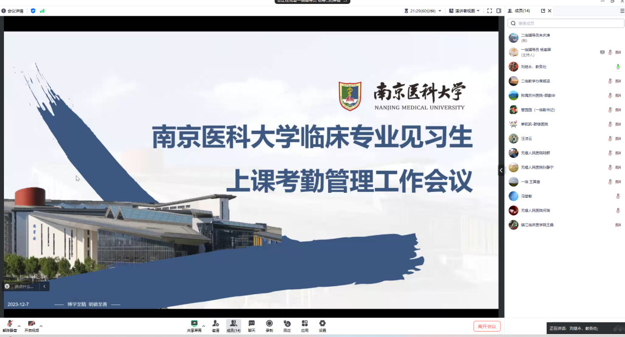 2023年12月7日下午14:00,我院通过腾讯会议的方式,会同教务处有关领导、第二临床医学院相关领导老师、各见习医院驻点班相关负责老师,共同召开临床见习生上课考勤管理工作会议,会议由第一临床医学院党委副书记、副院长管园园主持。