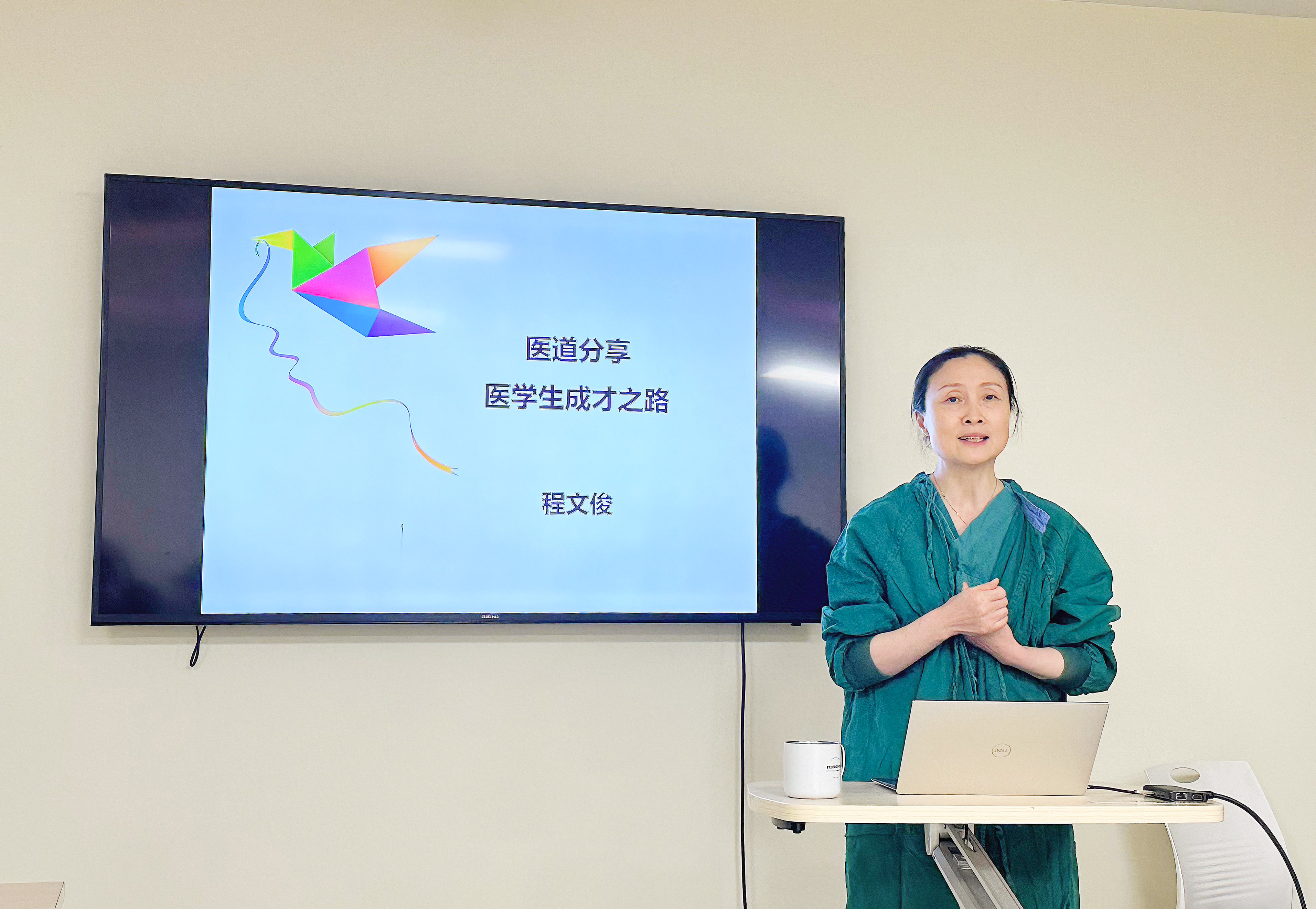 在手术结束后,程主任为同学们开展了以“医道分享——医学生成才之路”为主题的讲座。在讲座中,程主任强调了奉献、合作、技术及人文关怀对医学生的重要性。她讲到:“这个职业你选择他,就意味着更多的奉献。”她也讲到:“在临床的工作中不能单打独斗,要协作,要同心戮力才能成功。”最后,她强调:“过硬的技术,足够的胆量,是每个医生都要配备的。但与他们同样重要的,是作为一个医生的善良和真诚。所谓:‘德不近佛者不能为医。’”