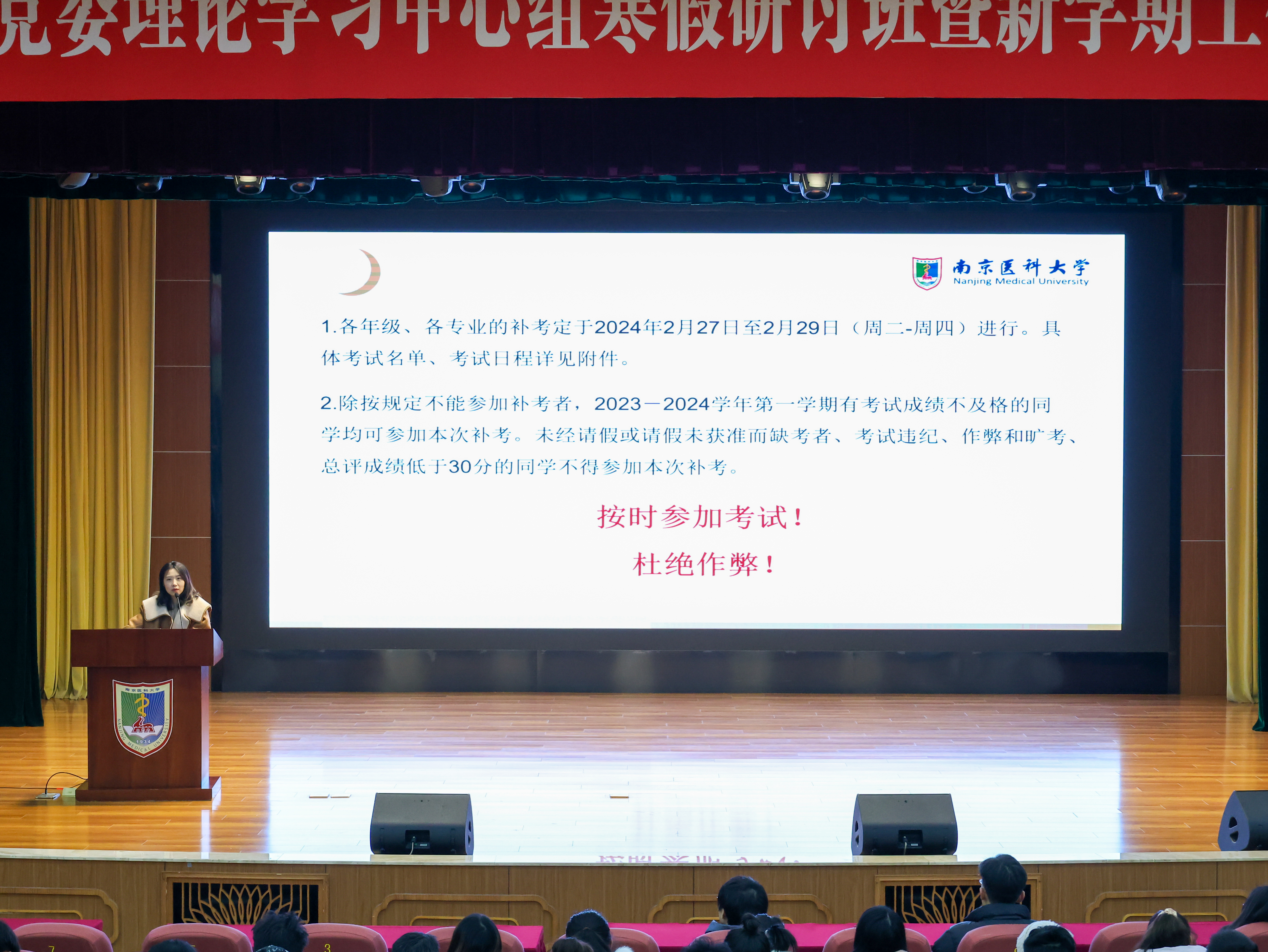 2月25-26日,第一临床医学院2023级新学期年级大会在江宁校区大学生活动中心报告厅及明达楼209教室举行。第一临床医学院党委副书记、副院长吴雅娜老师,2023级辅导员王榆、栾超老师以及2023级全体本科生参加了此次大会。