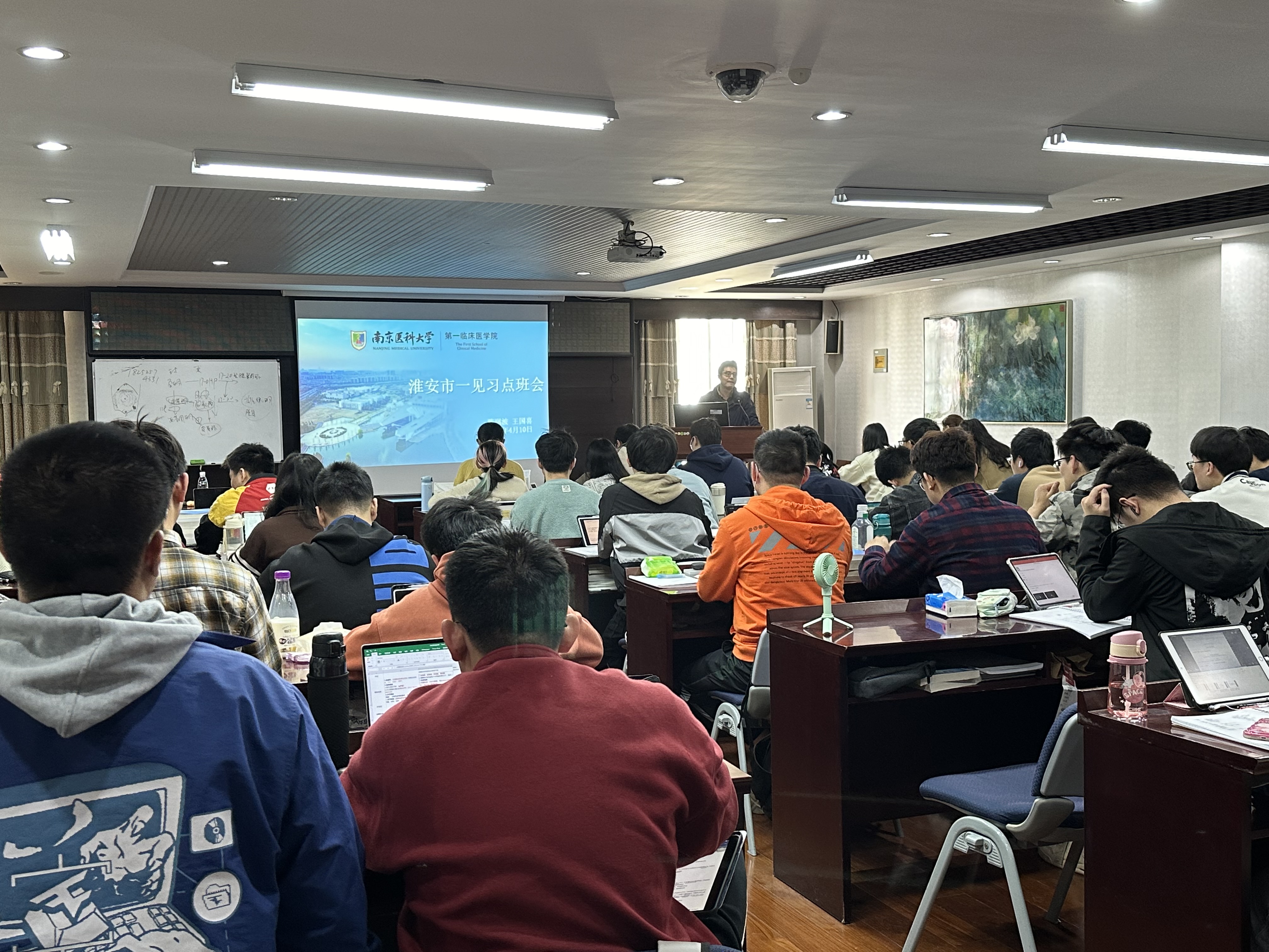 2024年4月10日,第一临床医学院2020级辅导员陈老师、王老师赴淮安市第一人民医院见习点召开主题班会,五年制临床5班、6班全体同学参会。