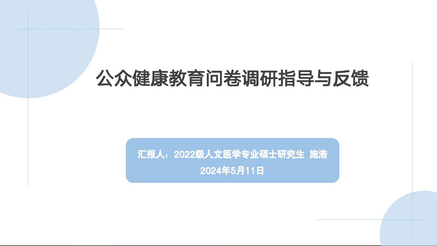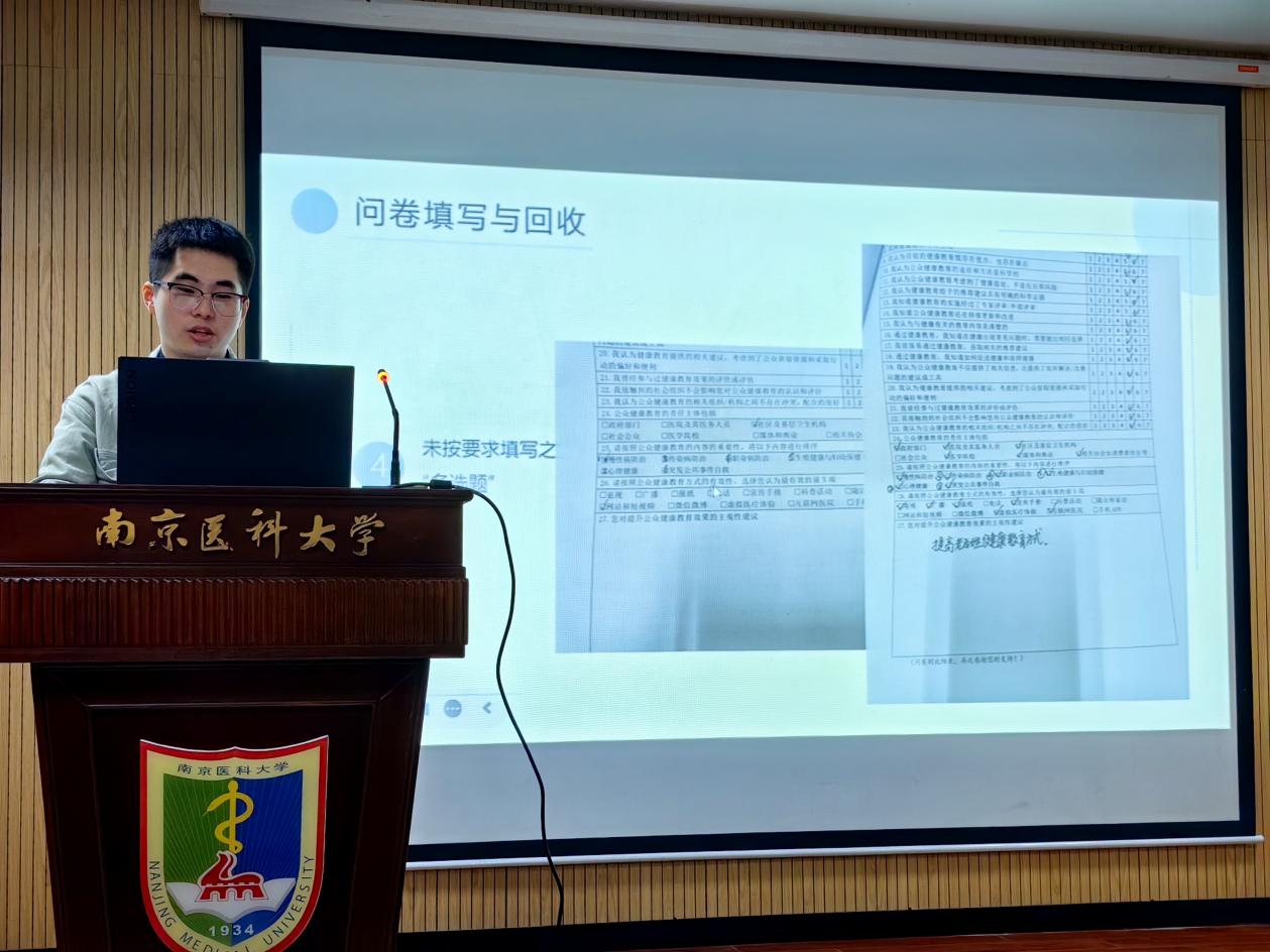 随后,施浩同学结合暑假期间同学们参与问卷调研的实际情况,从问卷设计与发放、问卷填写与回收、问卷数据录入、总结与建议四个部分入手,介绍了此次公众健康教育问卷调研活动的情况,并通过多篇定量文章的举例分析,为同学们介绍统计学分析的思路和方法。