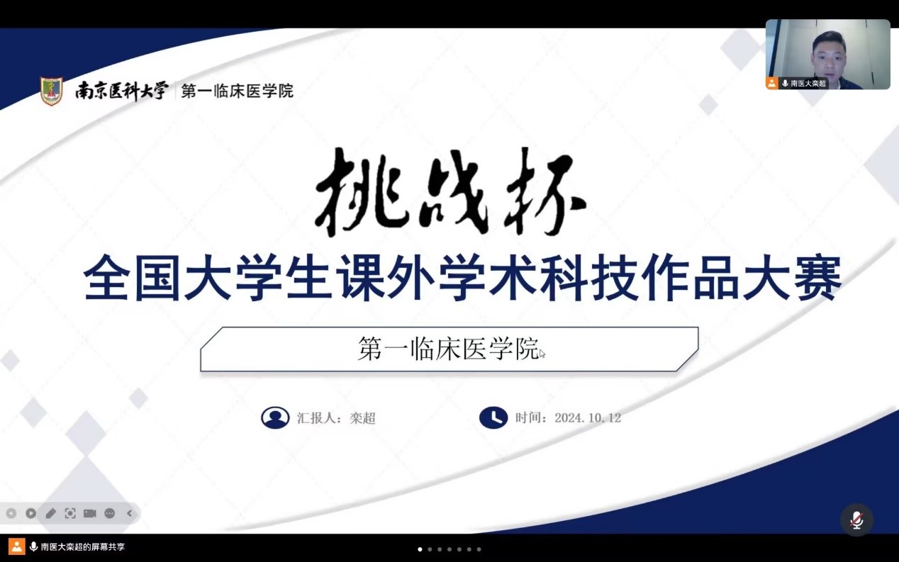 2024年10月14日晚18:30,南京医科大学第一临床医学院成功举办了第十四届“创新杯”大学生课外学术科技作品竞赛学院院赛。院赛邀请到第一临床医学院党委副书记副院长吴雅娜老师、第一临床医学院副院长凡进老师、第一临床医学院学科办主任陈欢欢老师、生物医学与信息工程学院胡晓雯老师担任评委,此外,第一临床医学院辅导员栾超老师列席比赛。