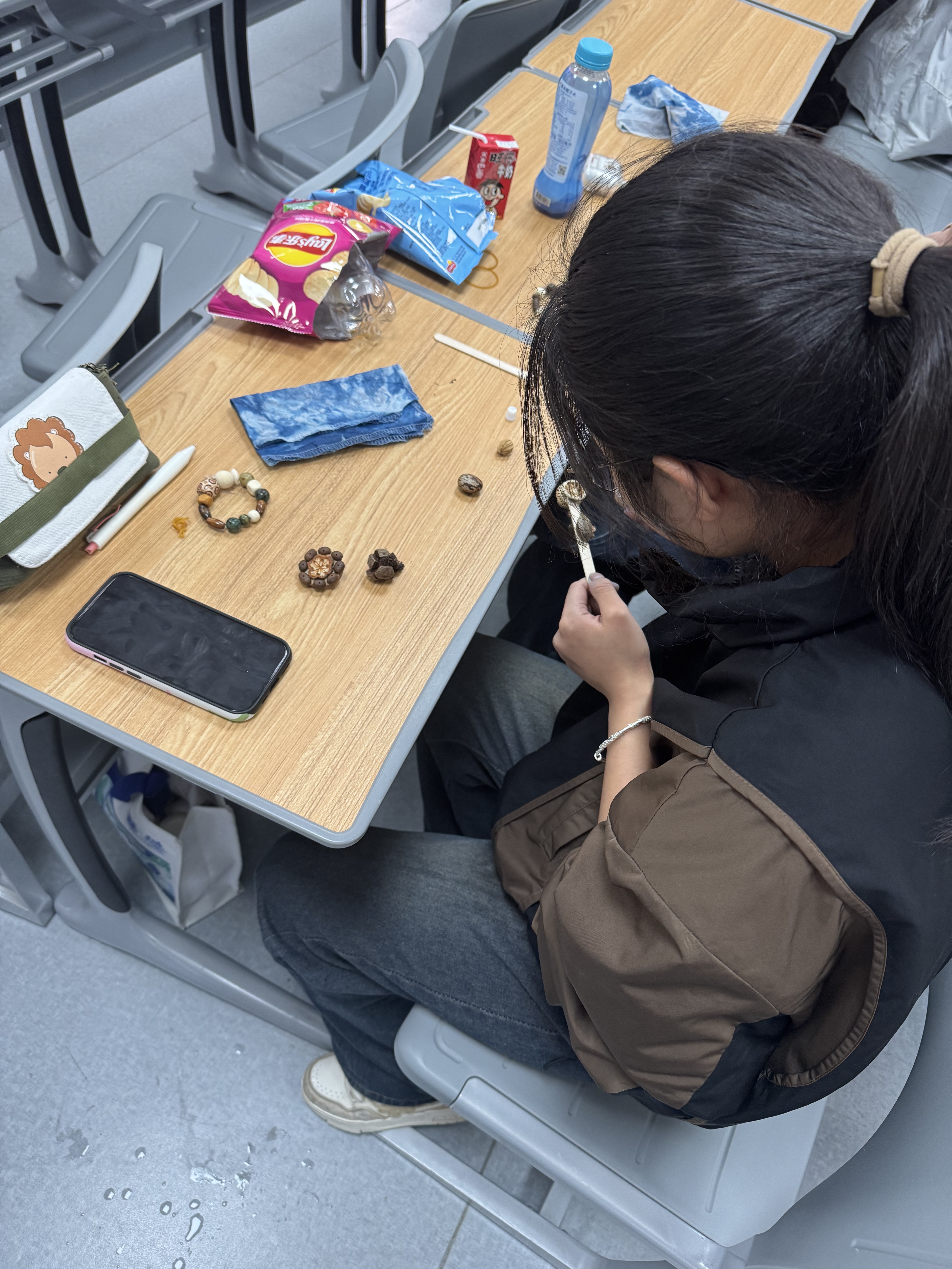 首先,蒋正阳等同学分享了中草药知识,如黄芪中草药的介绍,从武侠小说看中草药等。内容专业而不失趣味性,不仅让同学们对博大精深的中草药知识产生了好奇和兴趣,也让大家对其有了进一步的了解。接着,同学们自己用发放的中草药制作了配饰:手链,胸针,项链等。同学们亲手接触了各种中草药,也对他们有了近距离地观察。最后,同学们利用中草药进行了扎染,让中草药的汁液在白布上绽放出蓝色的花。