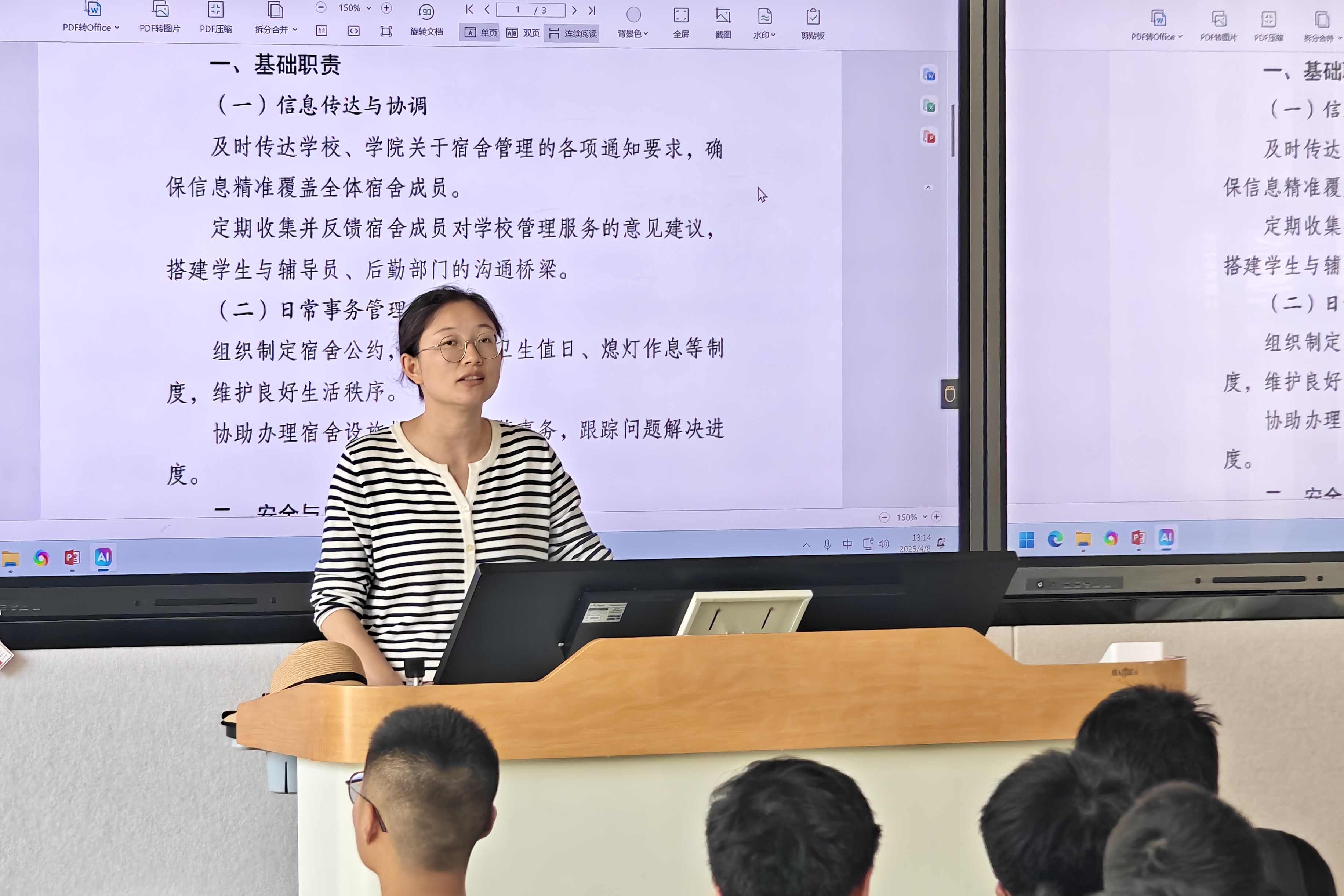 为进一步夯实学生寝室管理根基,营造安全、文明、和谐的校园生活环境,4月8日,2024级学生工作办公室在博学楼第三阶梯教室组织开展宿舍网格员培训会。