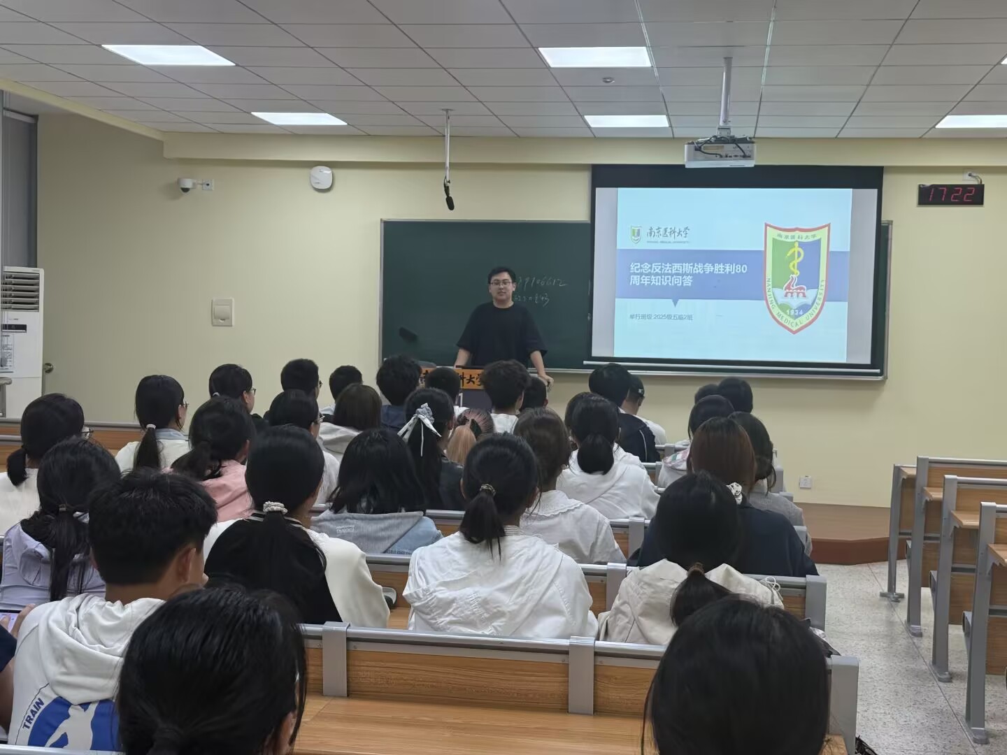 10月14日晚,第一临床医学院五年制临床2班在博学楼A307教室成功举办“纪念反法西斯抗战胜利80周年”主题知识竞赛。本次活动以个人竞答为主要形式,通过选择题、简答题和抢答环节,全面考察同学们对抗战历史的了解程度,取得了良好效果。