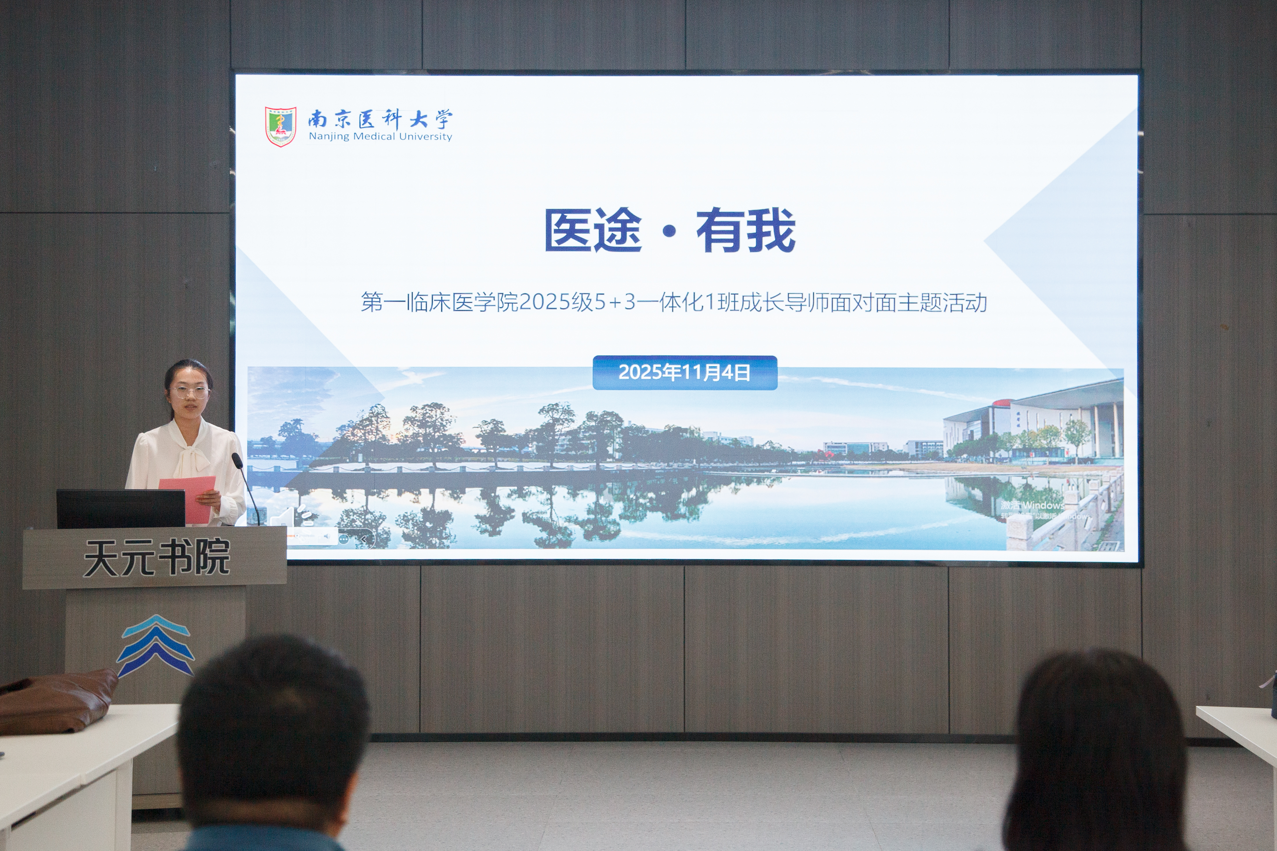 11月4日下午16:00,在江宁校区天元书院报告厅,2025级临床医学(5+3一体化)1班成长导师、南京医科大学副校长、江苏省人民医院院长刘云教授为同学们带来了一场启智润心的成长导师见面会。参加此次会议的还有南京医科大学第一临床医学院副书记、副院长吴雅娜老师,2025级临床医学(5+3一体化)1班兼职班主任尹建星老师,2025级全体辅导员及2025级临床医学(5+3一体化)1班全体学生。此次见面会由2025级临床医学(5+3一体化)1班团支书李保珏主持。