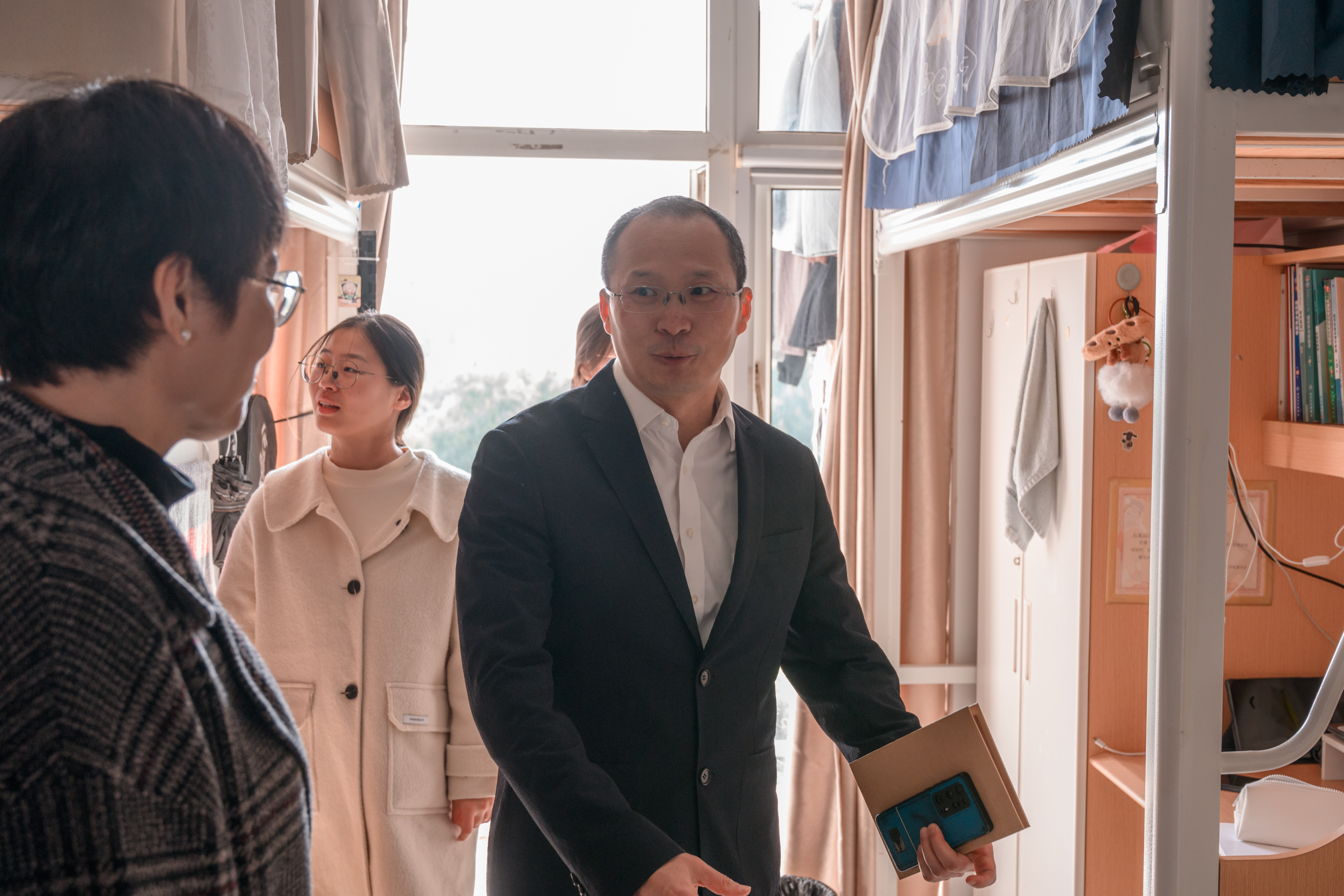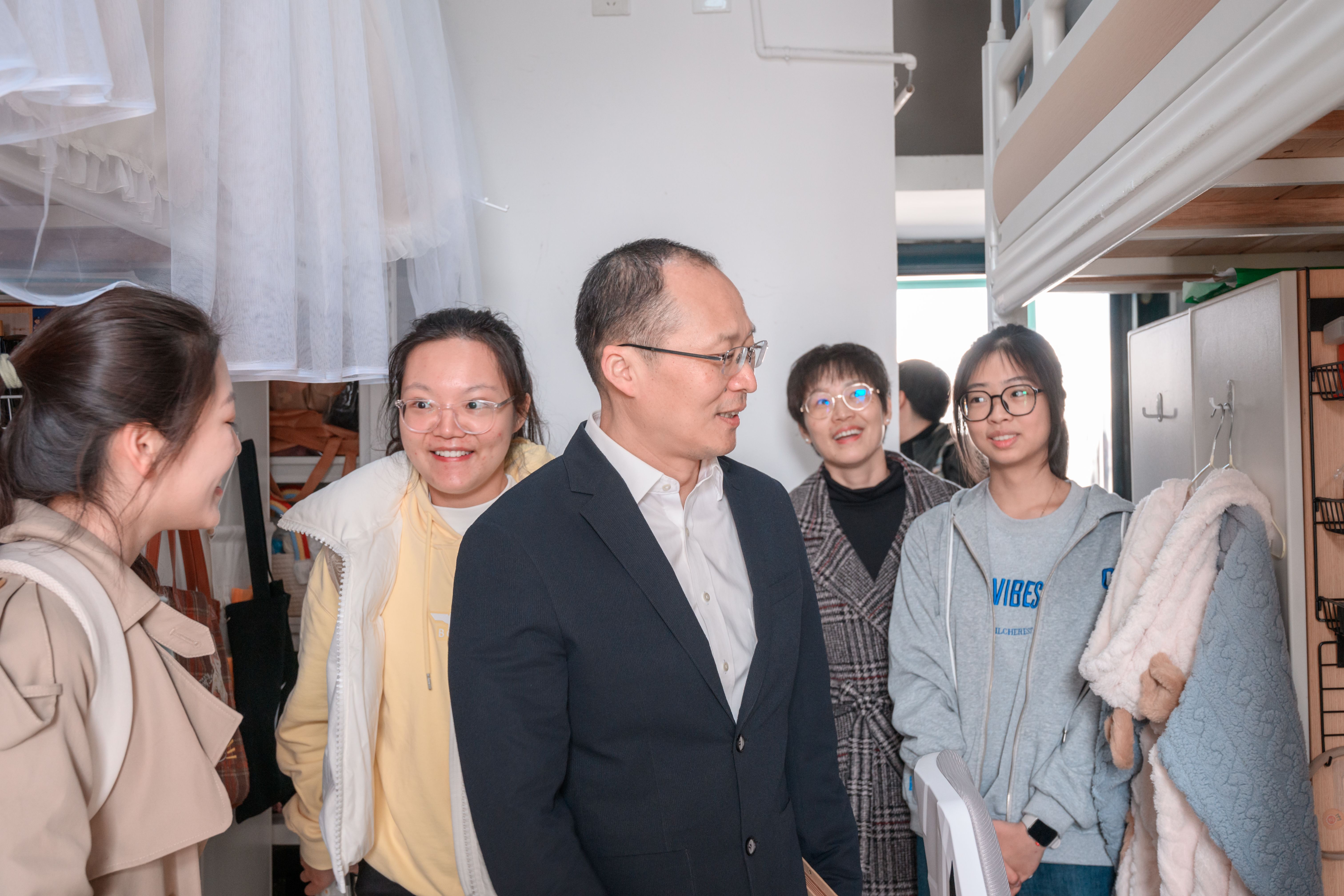 随后与会老师前往学生宿舍走访,走访中丁书记仔细了解同学们的日常点滴,叮嘱大家要合理安排时间、注重身心健康,营造温馨和谐的宿舍氛围。
