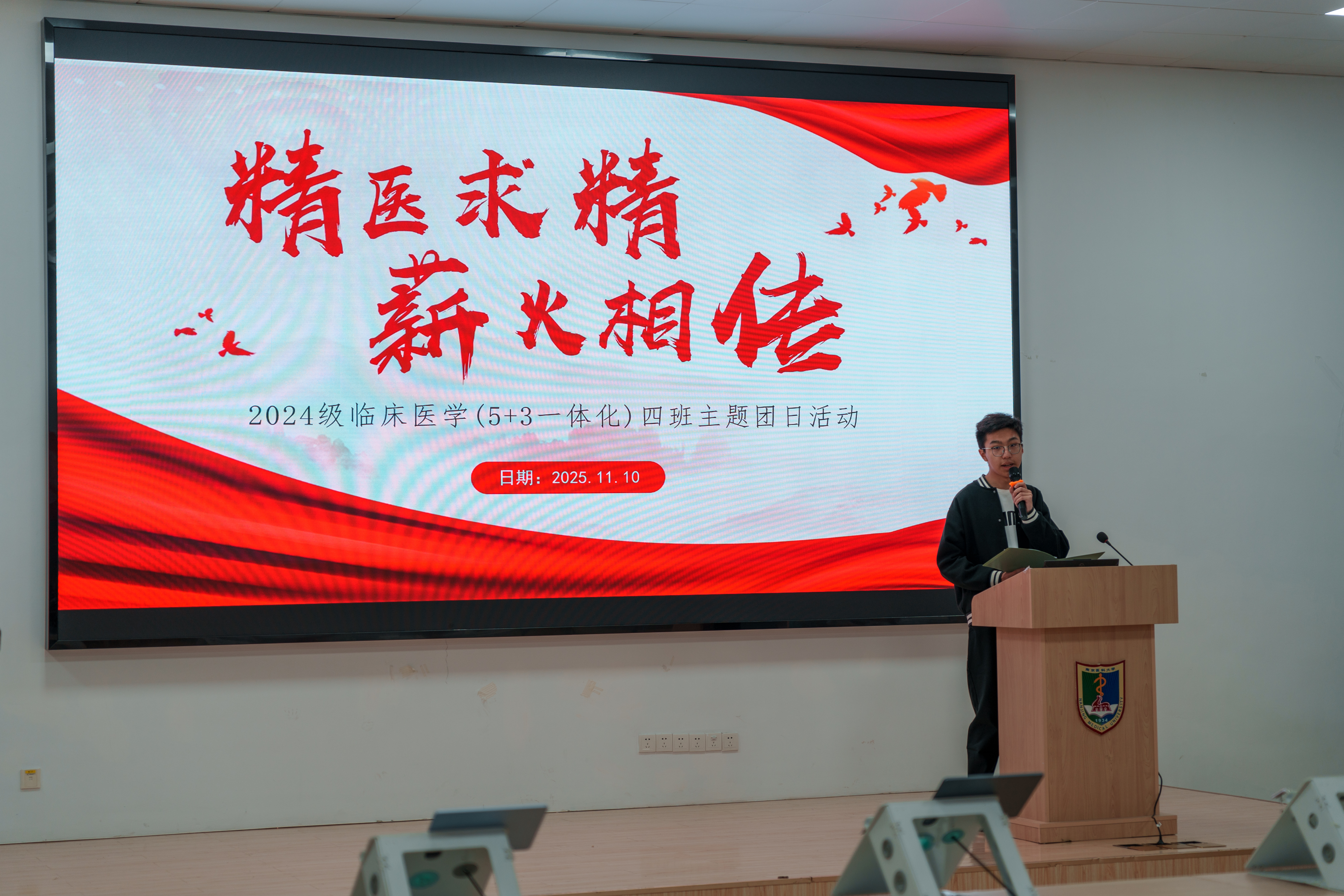 11月10日,2024级临床医学5+3一体化4班开展“精医求精·薪火相传”主题团日活动。校党委副书记丁强老师莅临团日活动现场,与同学们亲切交流,共话成长。参加活动的还有学院党委副书记、副院长吴雅娜老师,兼职班主任郑旭辉老师,辅导员陈琪波老师,活动由班级班长张珈瑜同学主持。