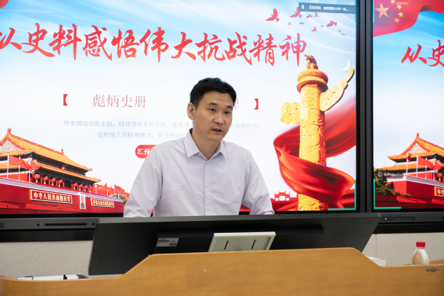 马克思主义学院习近平新时代中国特色社会主义思想概论教研室主任任文峰老师讲授训练营第一课。课程围绕抗战精神的内涵展开,具体阐述了以爱国情怀、民族气节、英雄气概和必胜信念为核心的精神实质,并结合史实分析了其时代价值。他在课程最后强调,青年学生要讲好抗战故事,把伟大抗战精神一代代传下去。