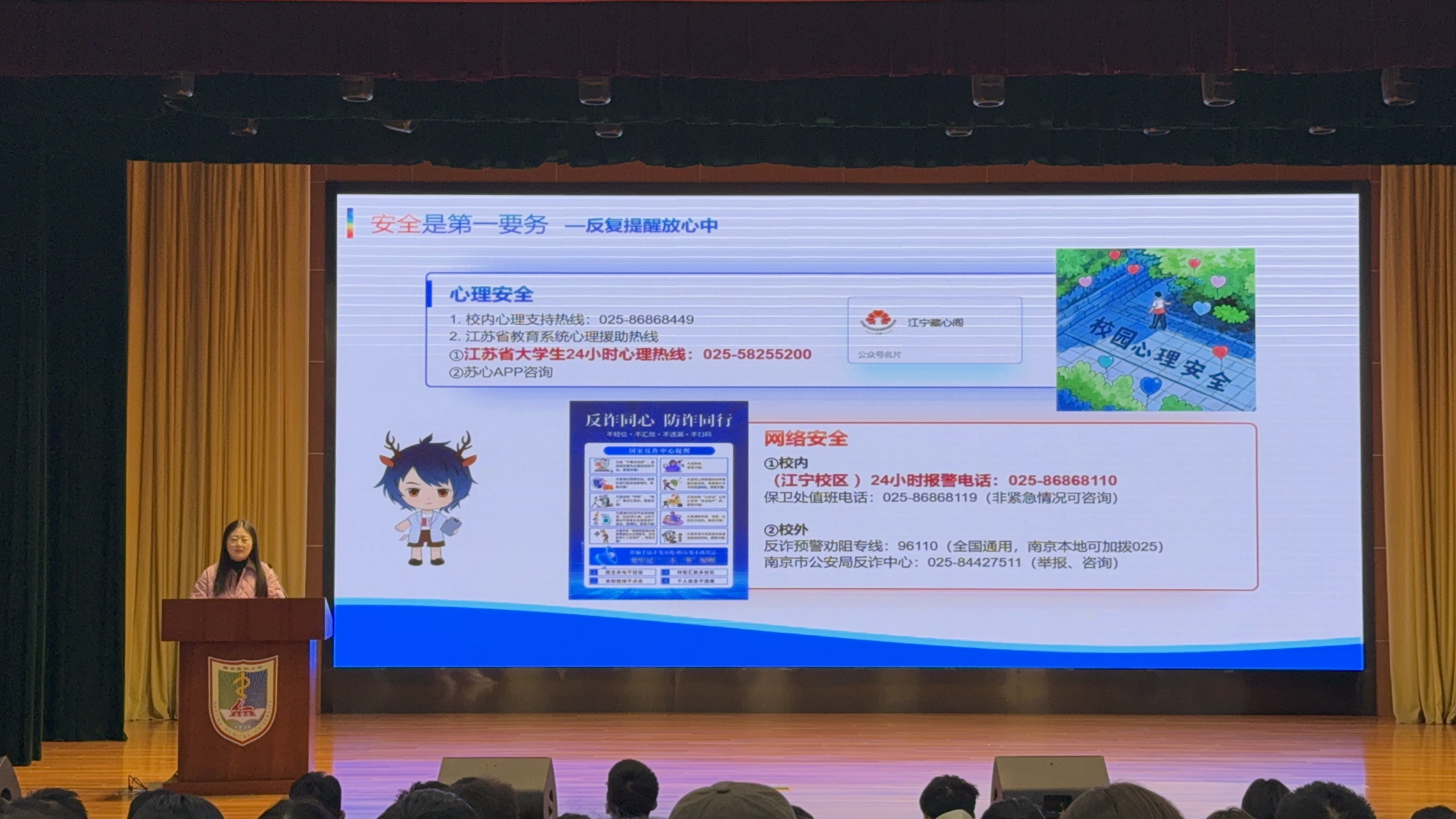 会议开始,辅导员张婷婷老师首先强调了日常管理方面的内容,包括请假制度、课堂纪律、宿舍管理等,针对过去的半个学期内发生的问题再次进行了重点说明,督促同学们勤勉奋进。随后,聚焦于安全问题,尤其是心理安全与网络安全,张老师提供了江宁藏心阁与保卫处电话等,为大家提供了求助方式,强化了大家的安全意识。