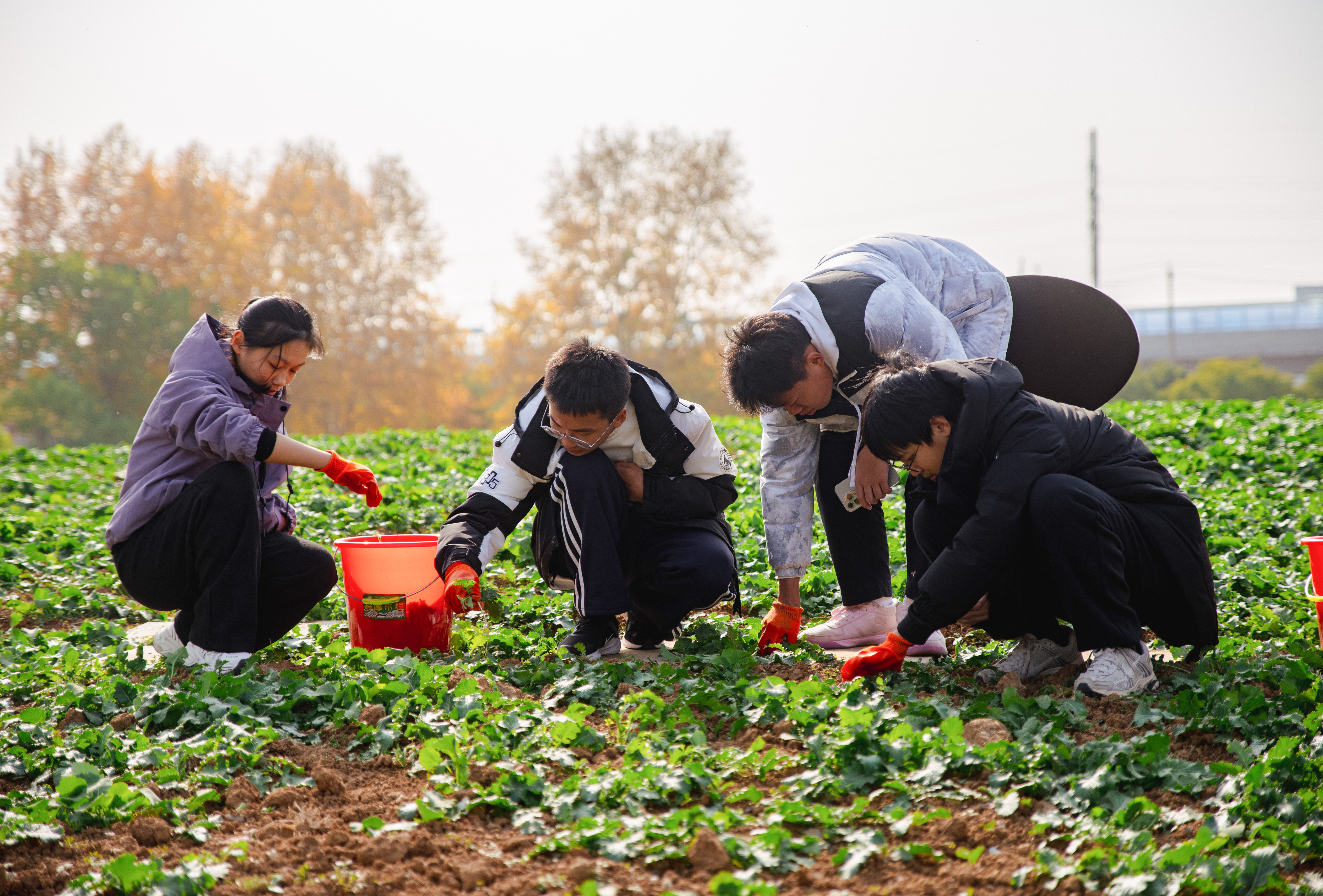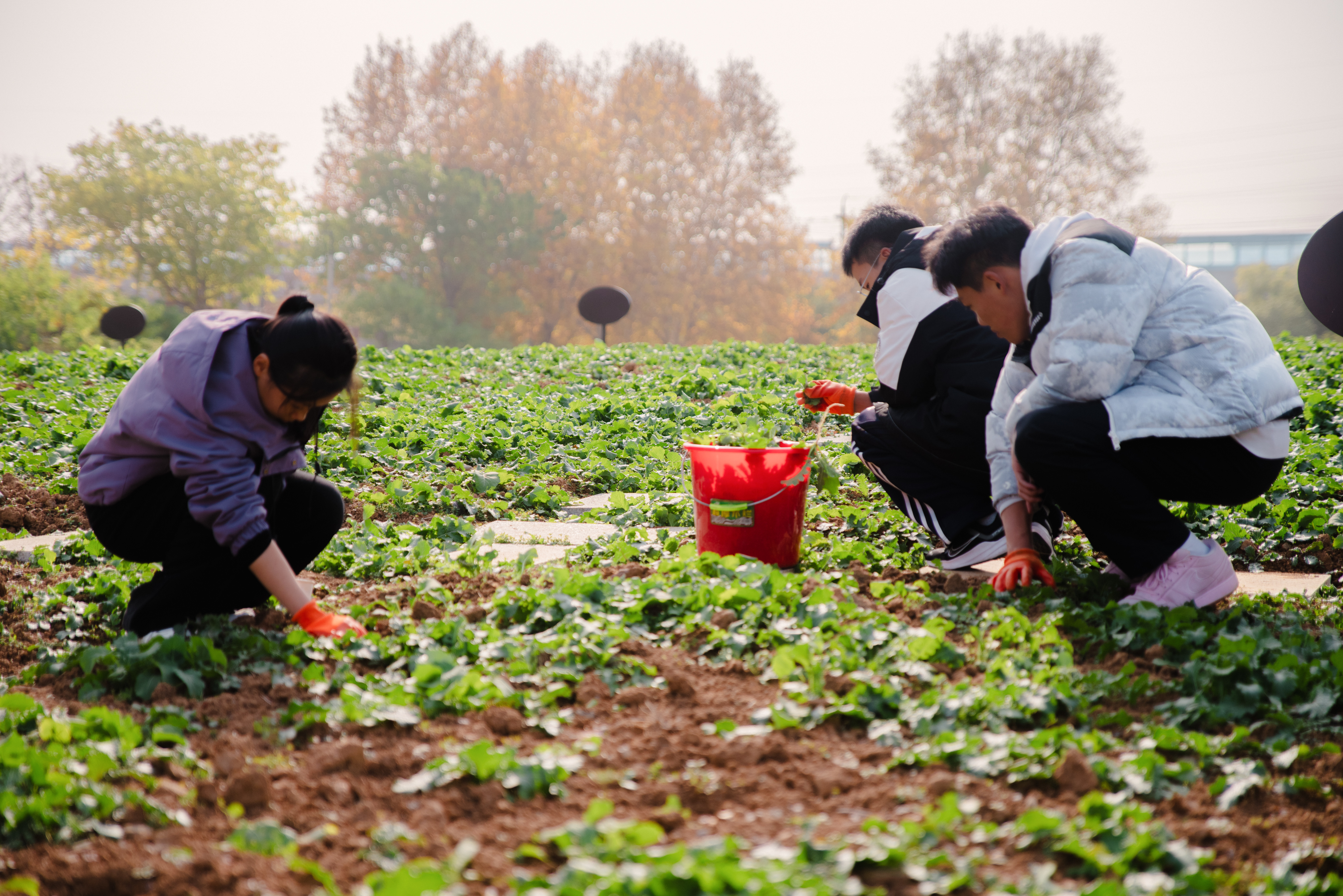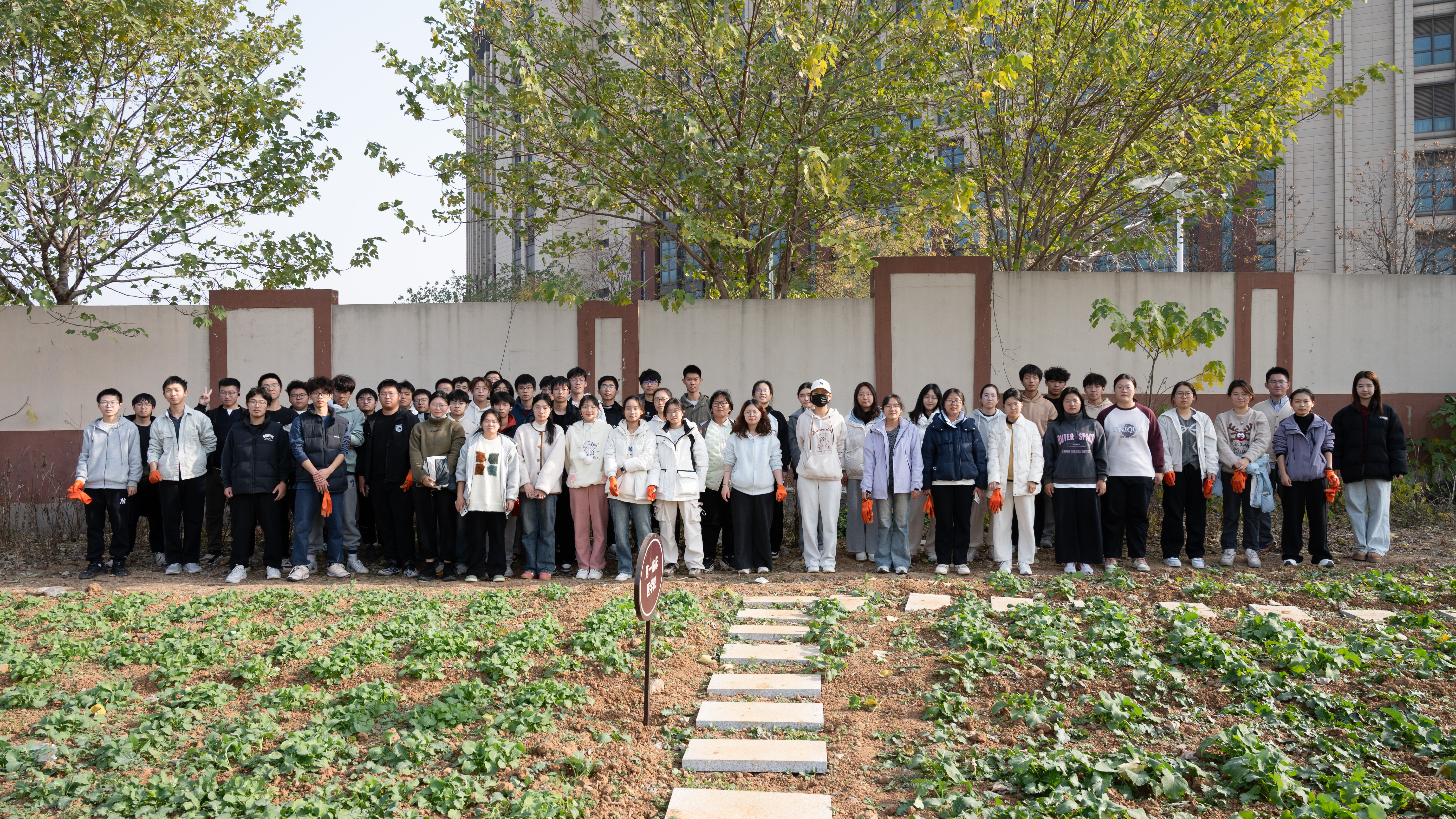 沾满细碎泥土的手套、堆着杂菜的红桶,见证着同学们的专注与投入。活动尾声,55名参与者围聚在绿意盎然的菜田间合影留念,笑容里满是劳作后的充实与真切的喜悦。