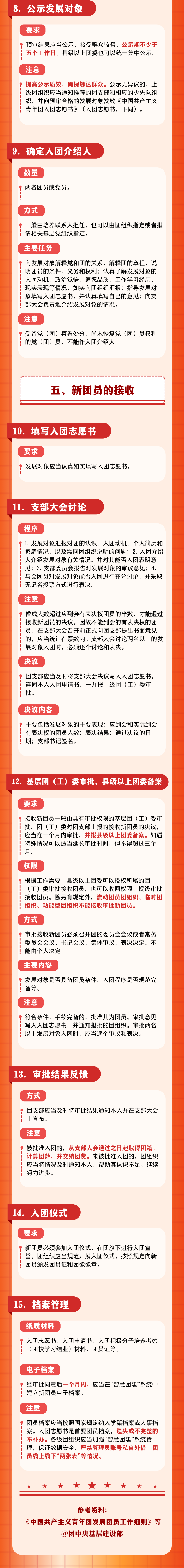 根据2023年8月共青团中央修订《中国共产主义青年团发展团员工作细则》(请点击文末阅读原查看),发展团员分申请入团、入团积极分子的确定、教育培养和考察、发展对象的确定、新团员的接收5个阶段15个步骤。