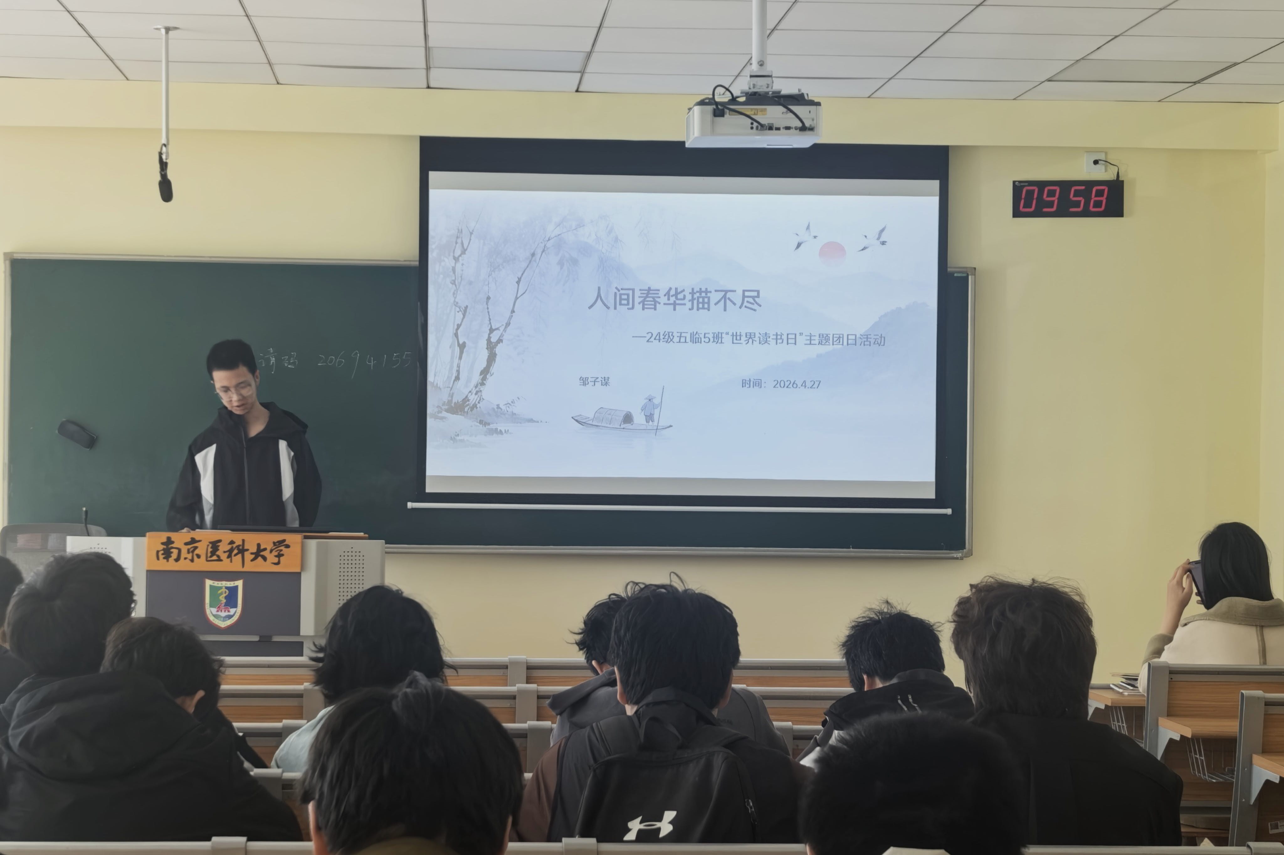 人间春华描不尽,书中天地揽无穷。为响应时代号召,营造书香氛围,4月27日,24级临床医学五年制5班全体同学于博学楼A208开展世界读书日主题团日活动。本次活动主要以ppt汇报形式进行书籍交流分享,由团支书邹子谋同学主持。